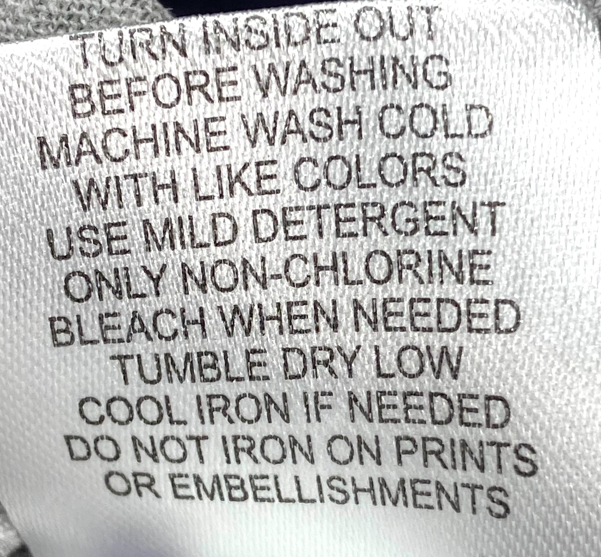 Care instructions: Turn inside out before washing-- Machine wash cold with like colors -- Use mild detergent -- Use only non-chlorine bleach when needed -- Tumble dry low -- Cool iron if needed -- Do not iron prints or embellishments --