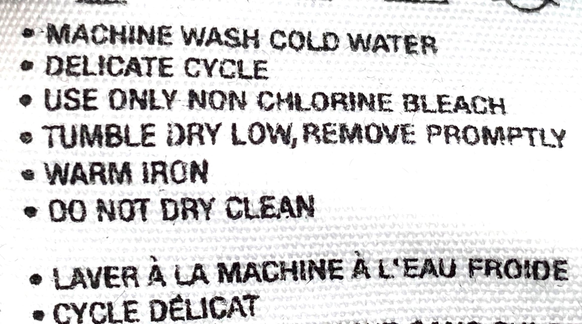 Care instructions: Machine wash cold water -- Delicate cycle -- Use only non-chlorine bleach -- Tumble dry low -- Remove promptly -- Warm iron -- Do not dry clean --