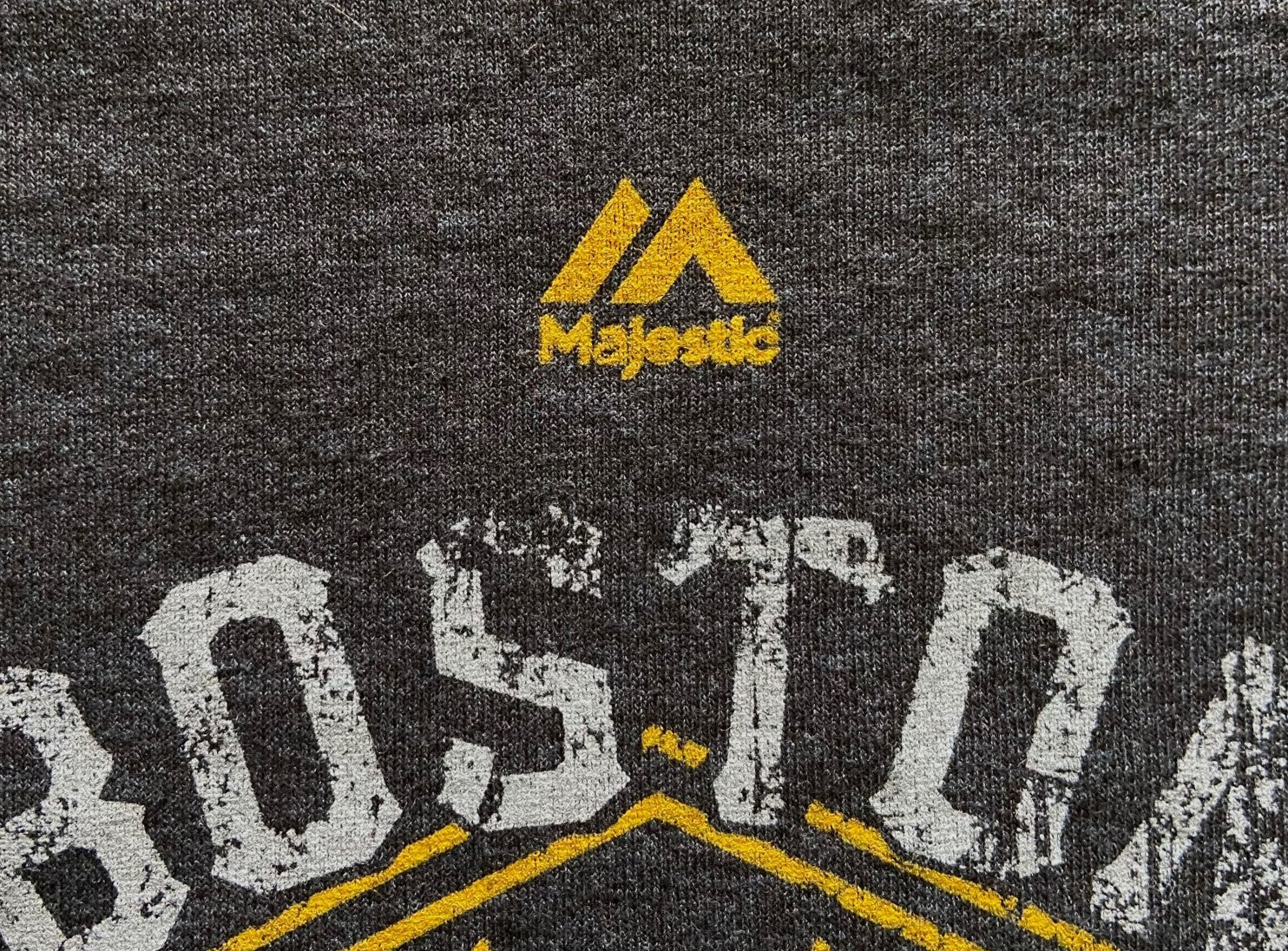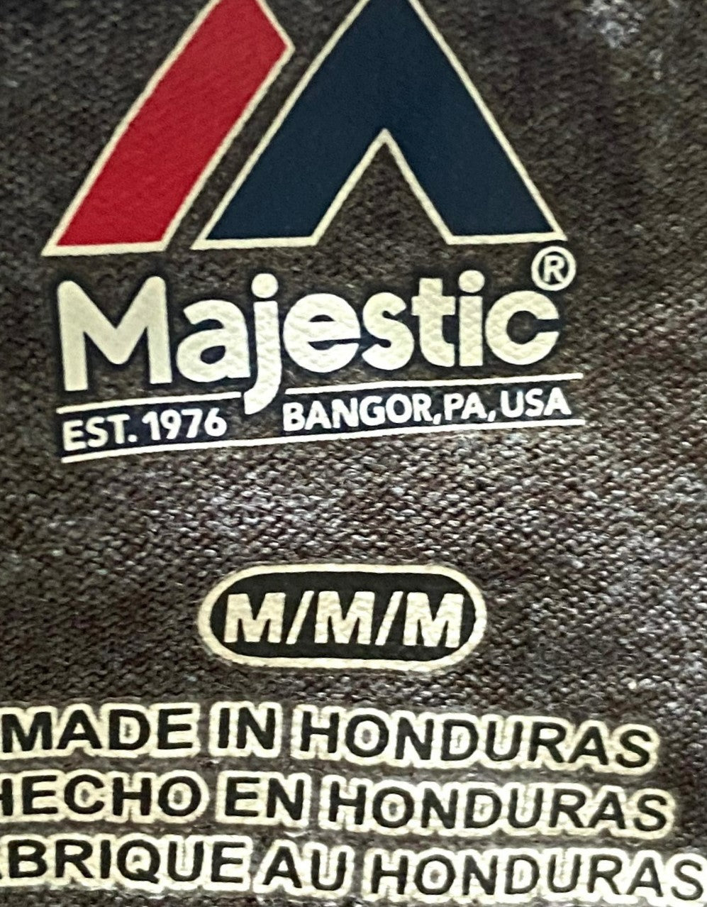 The vitals: It's 50% cotton/50% polyester, the T-Shirt is gray, was made in Honduras by Majestic, and also has the original tags. Remember to check out the photos! And go for it!