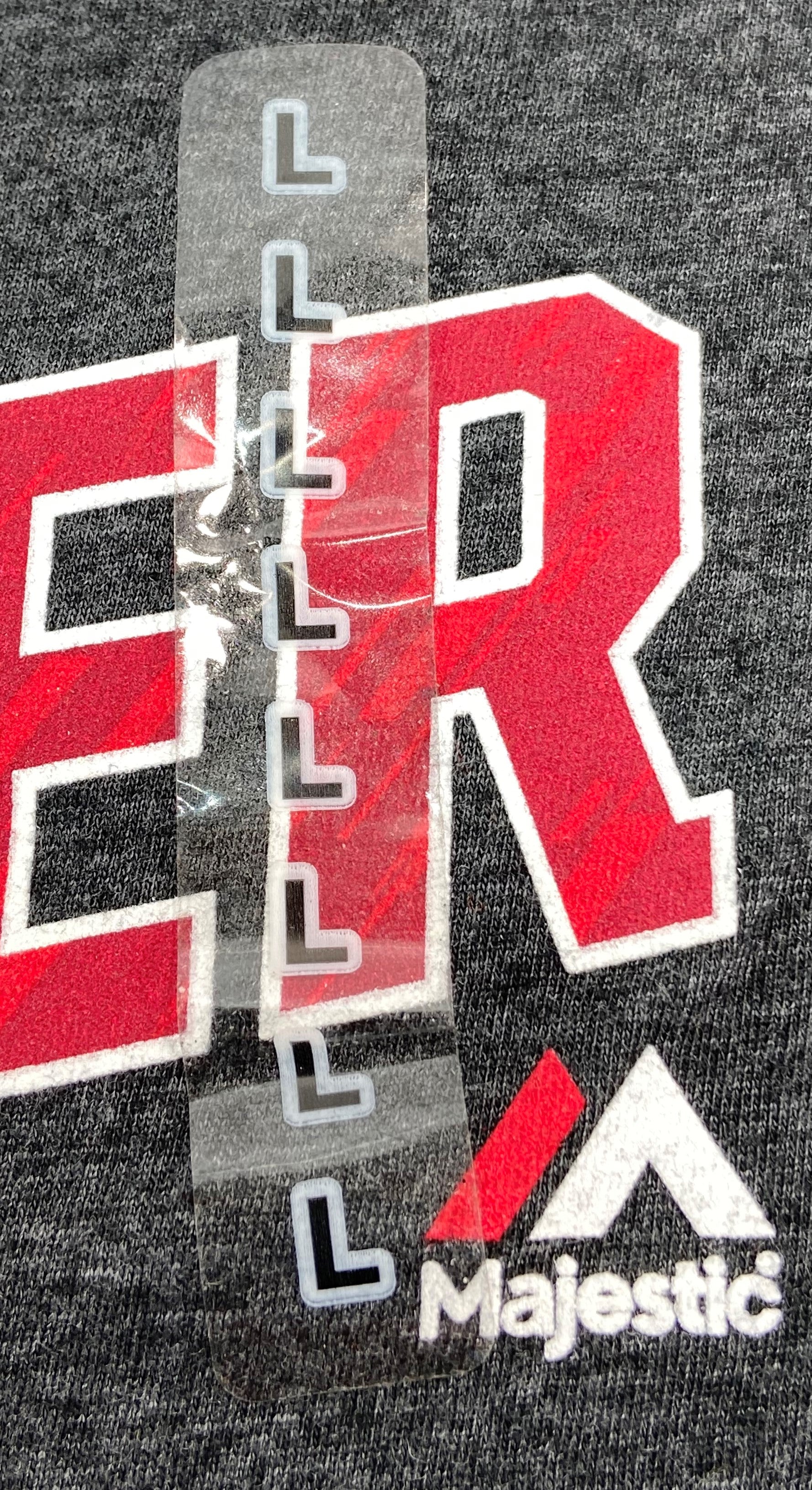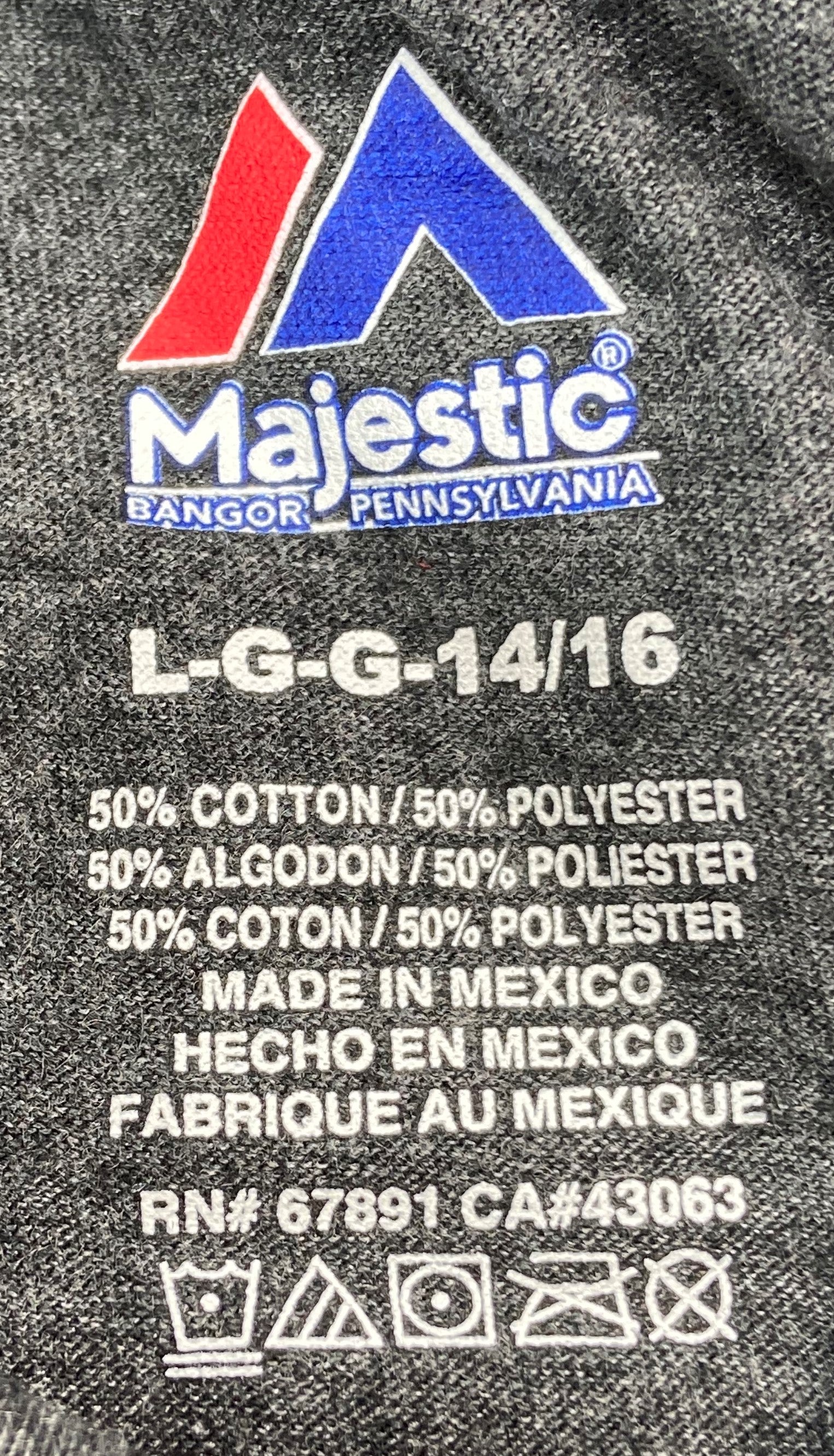 Here's an awesome NOS (New Old Stock) youth t-shirt from Majestic that will get any youth-size kid excited. It's 50-50 cotton/polyester, dark gray, and the design is pretty sweet. For a size check/comparison, the large (14-16) shirt is 18" across (armpit-armpit) and 24 1/2" from the back top of the neck to the bottom of the shirt. For the medium (10-12), the numbers are 16 and 22 3/4". Mexico. Original stickers. Check out the photos!