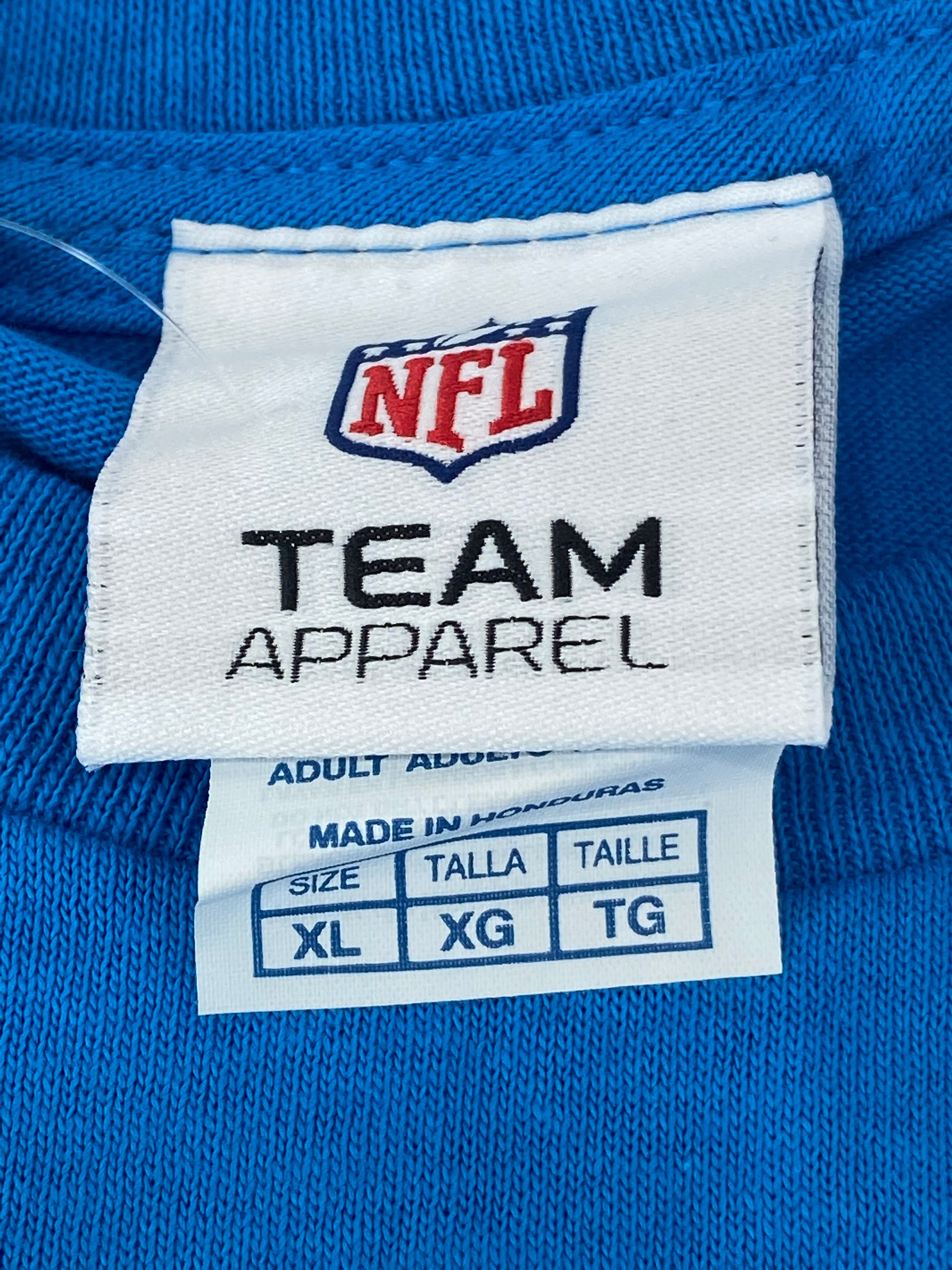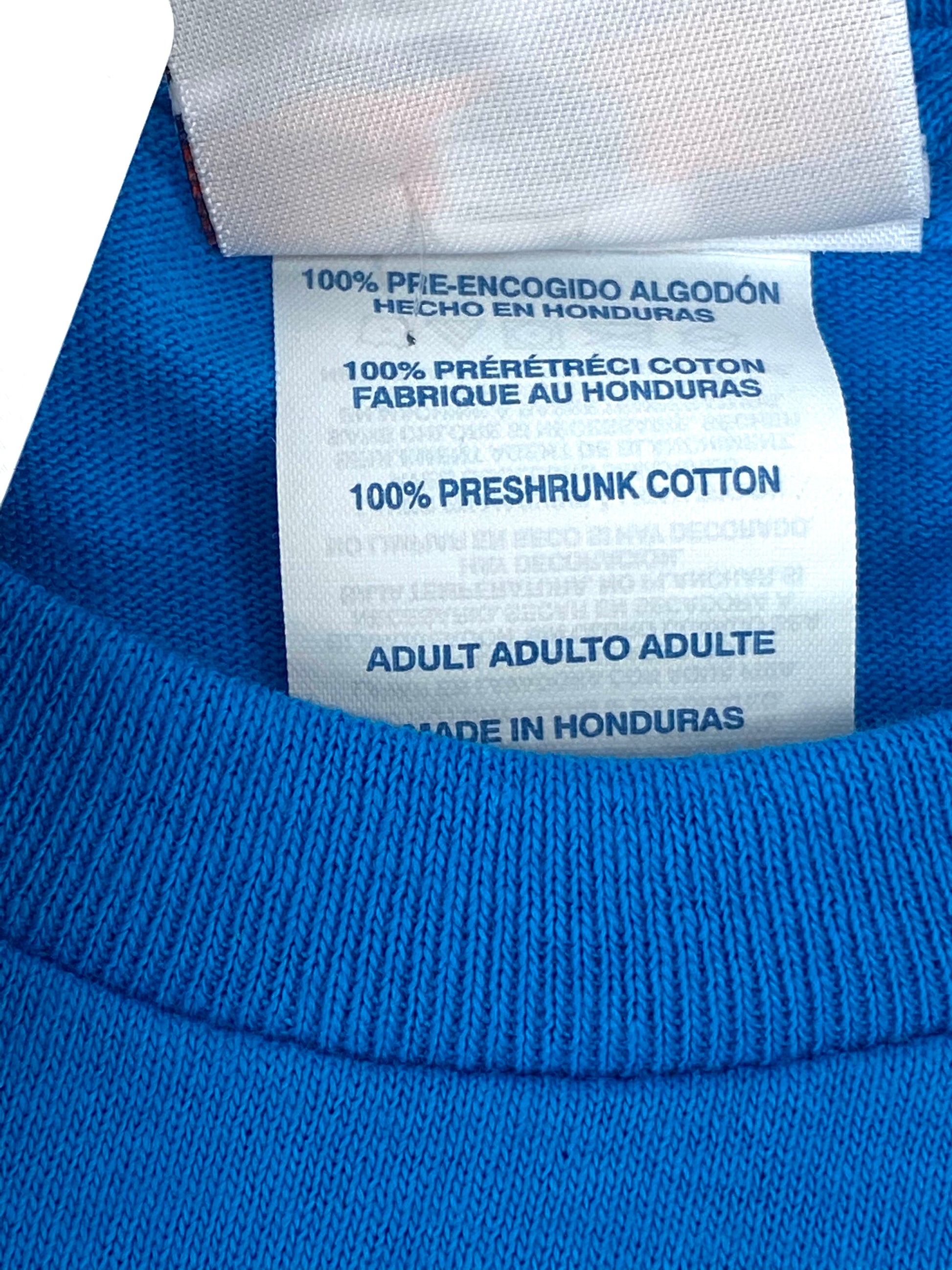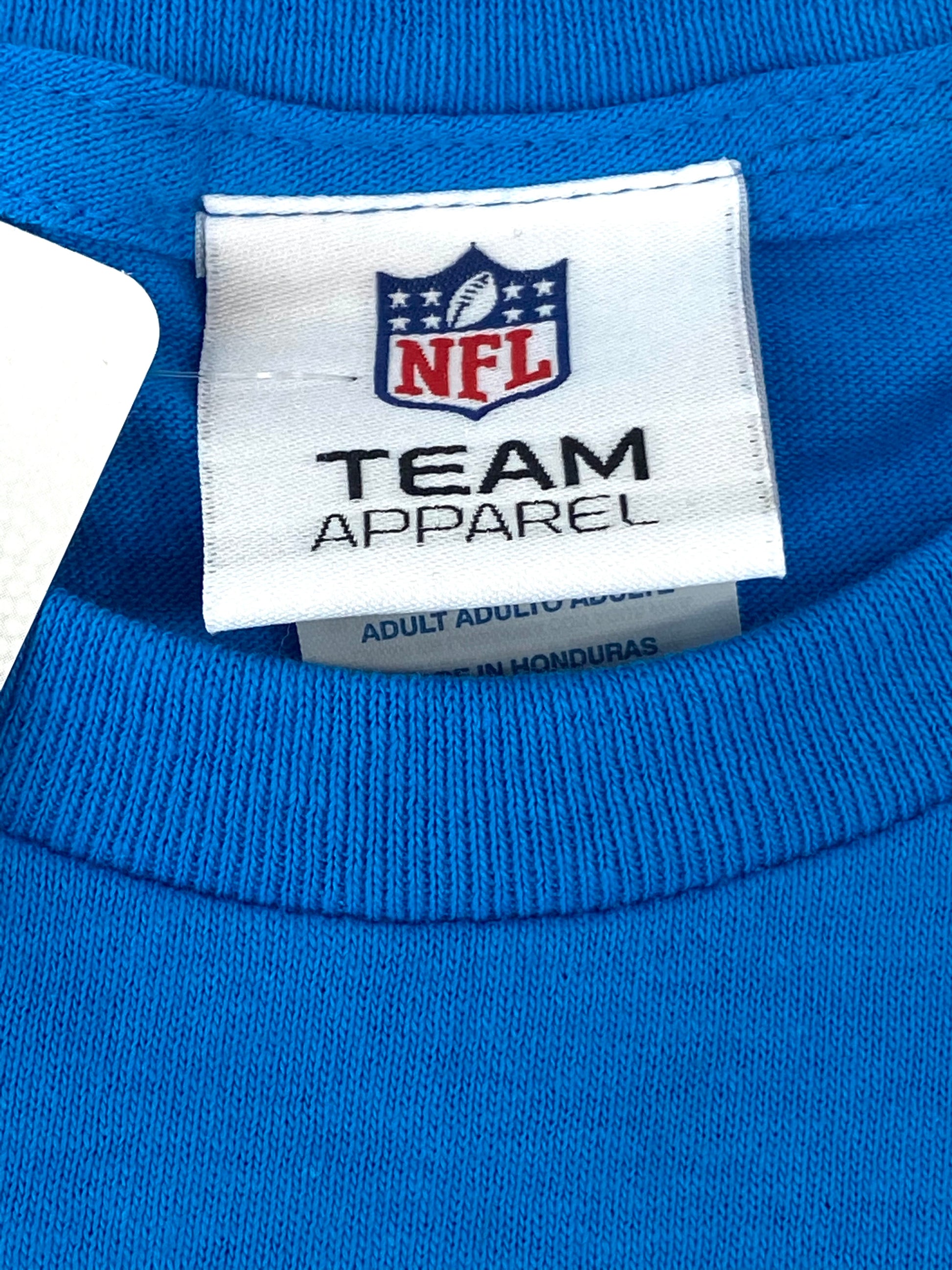 Here's an immensely popular tee that will please any Panthers fan, in a couple of sizes. Featuring the Panther logo on a Panther blue tee, it looks great and is 100% preshrunk cotton. It was made in Honduras and has the original tags. To assist in ordering, we measured 18" across the chest and 27" top to bottom for the small, and for the extra-large we came up with 23" across and 31" top to bottom. Check out the photos; this is one nice tee shirt, gang! Honduras.