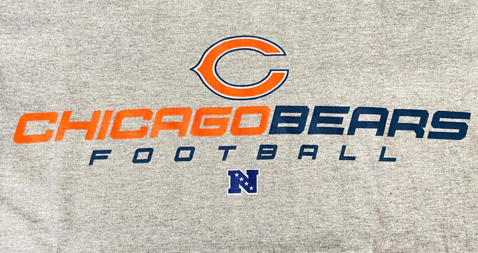Here's a great NOS (New Old Stock) Bears T-shirt that sports team colors, and is long-sleeved. It also features printing on the left sleeve as well. It's adult small, gray, and we hope you'll like it as much as we do.