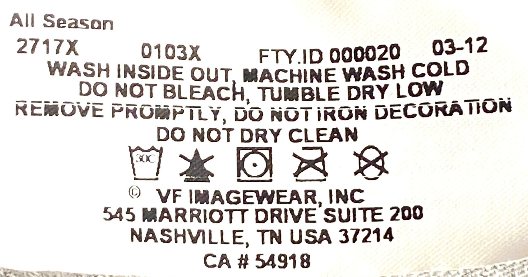Care instructions: Wash inside out, machine wash cold -- Do not bleach -- Tumble dry low, remove promptly -- Do not iron decoration -- Do not dry clean --