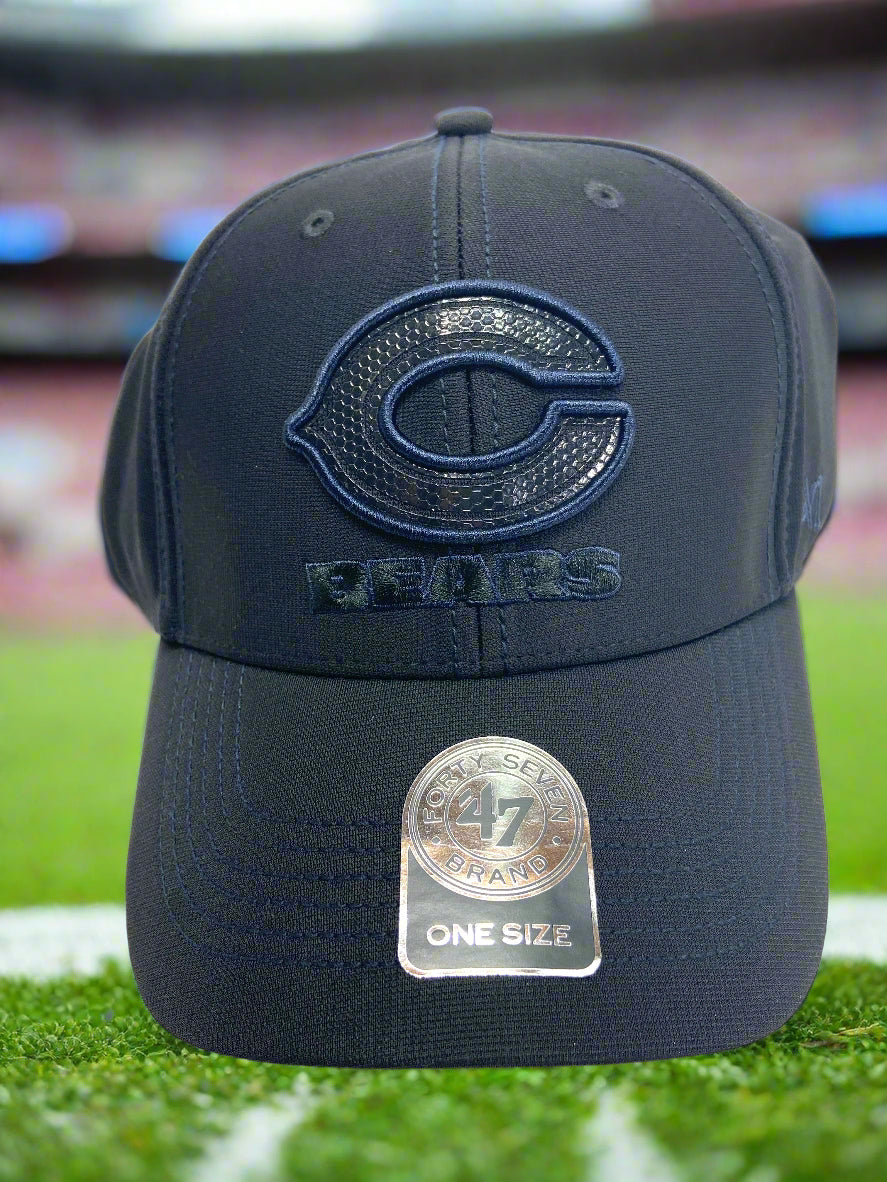 How here's a cap that isn't your every day ho-hum Bears cap. Actually, it looks like someone took a standard Bears logo cap and dipped it into a vat of black ink. Without question, not "typical"... Anyway, it's 94% polyester and 6% Spandex, with hook and loop closure. It's adult OSFA and was manufactured in China. Give '47 Brand credit for trying something a little different!