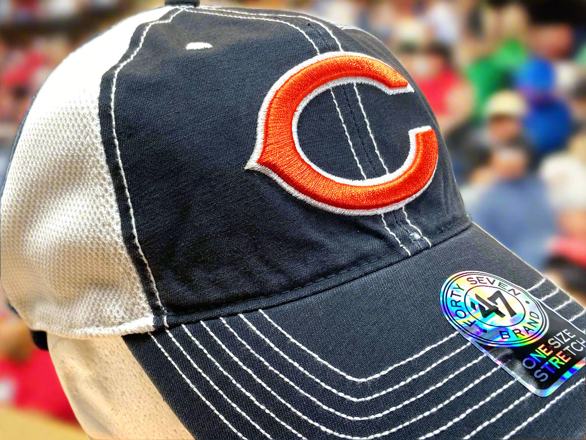 Stretch Fit and Mesh are the key components to this great Bears hat. Gotta love the rich 3-D embroidery and the front panels/bill which are 100% cotton. The rear mesh panels are, of course, 100% polyester. Made in China, complete with hanging hook and stickers. Check out the pics and imagine yourself with 'da Bears cap on...