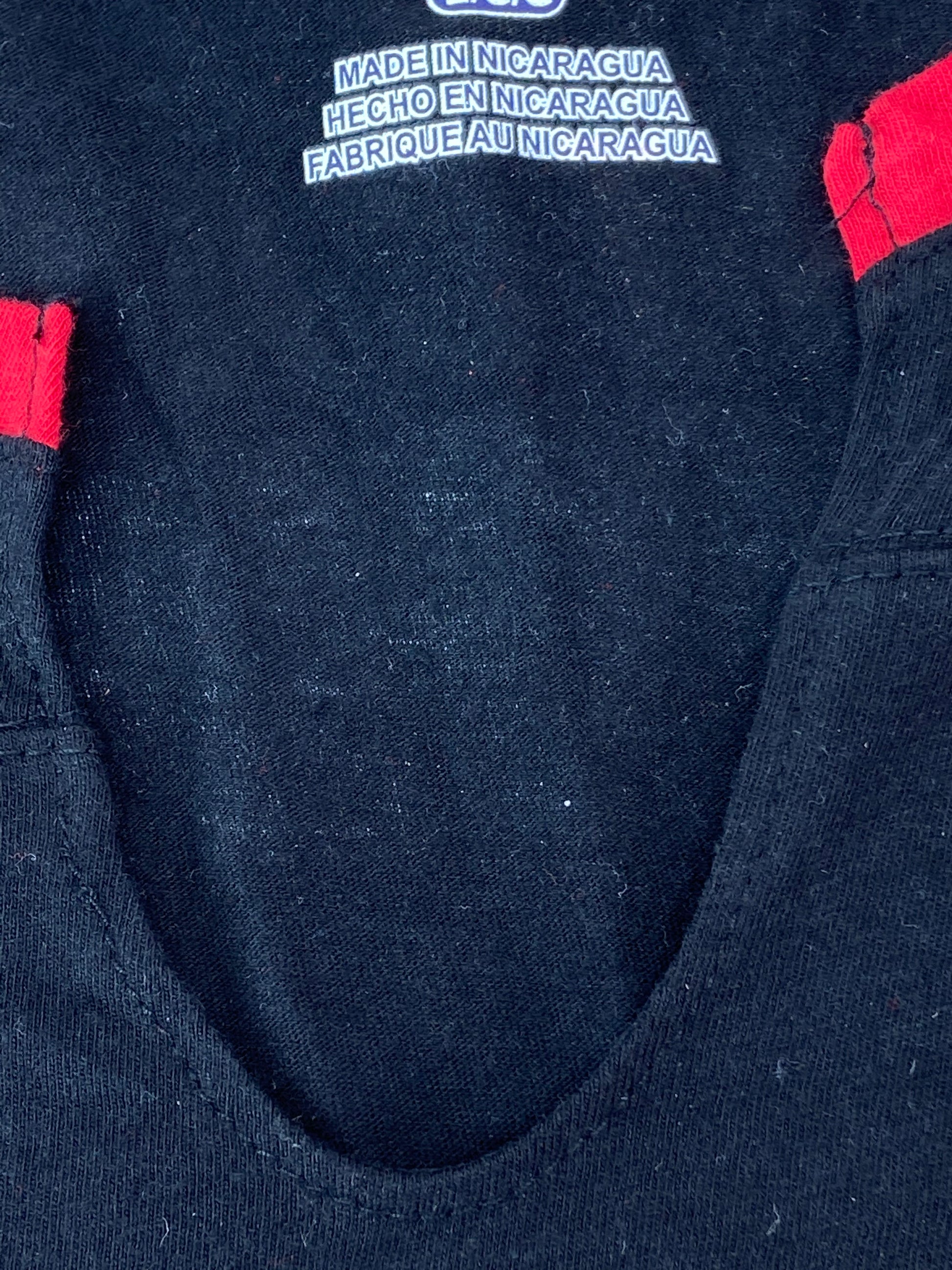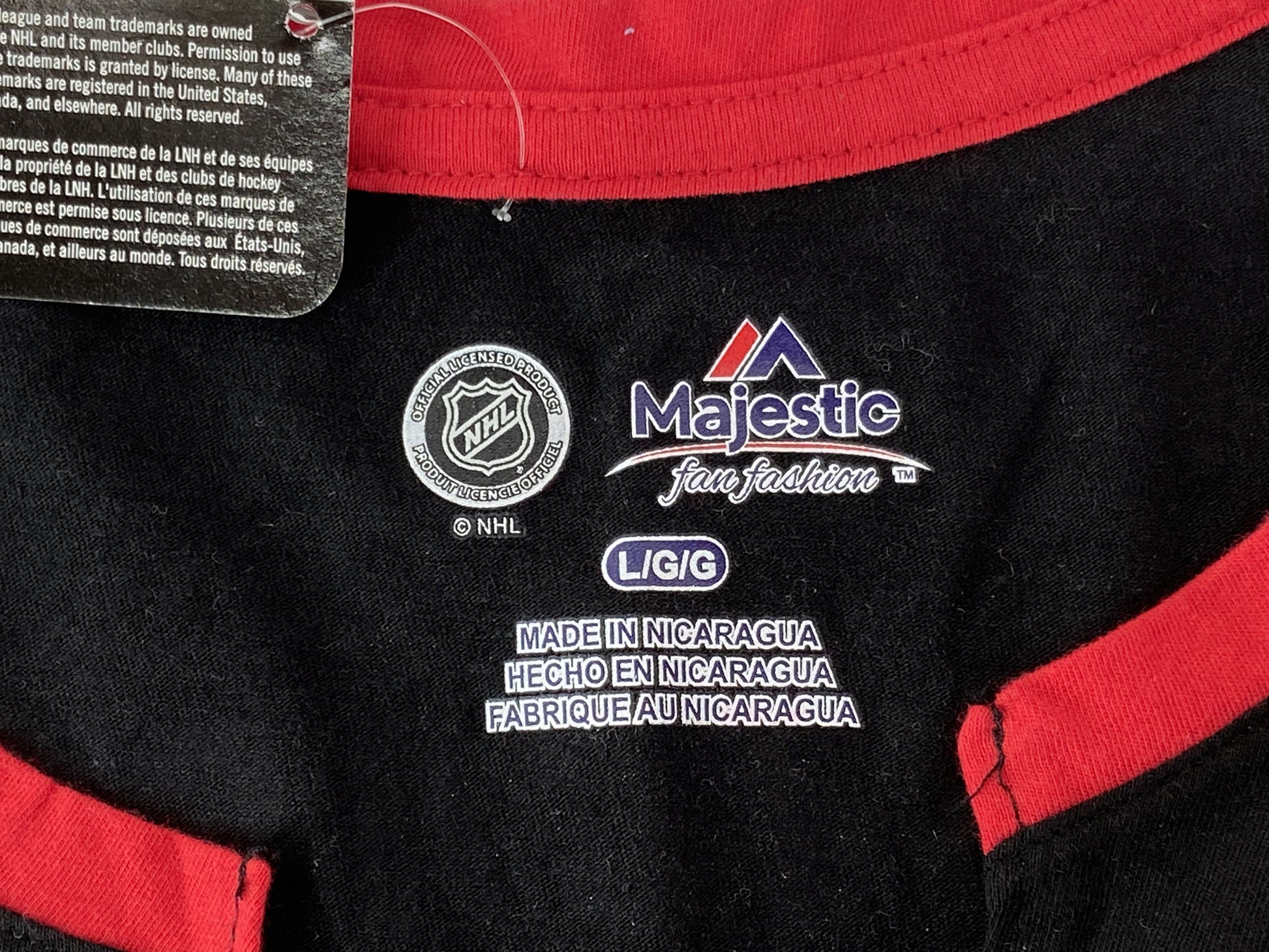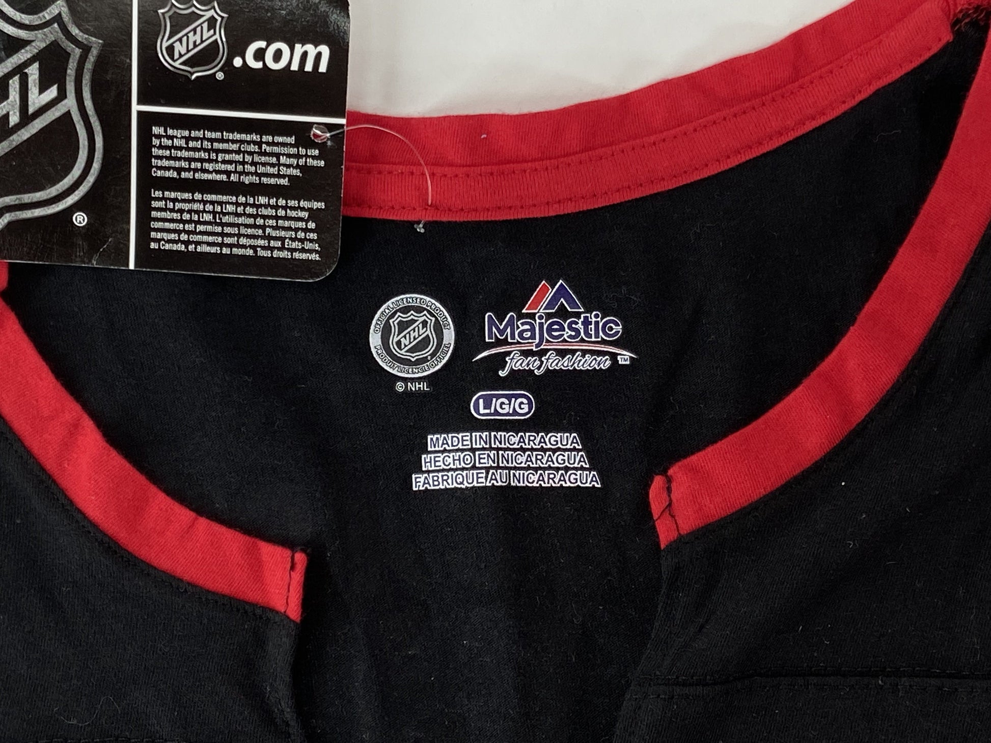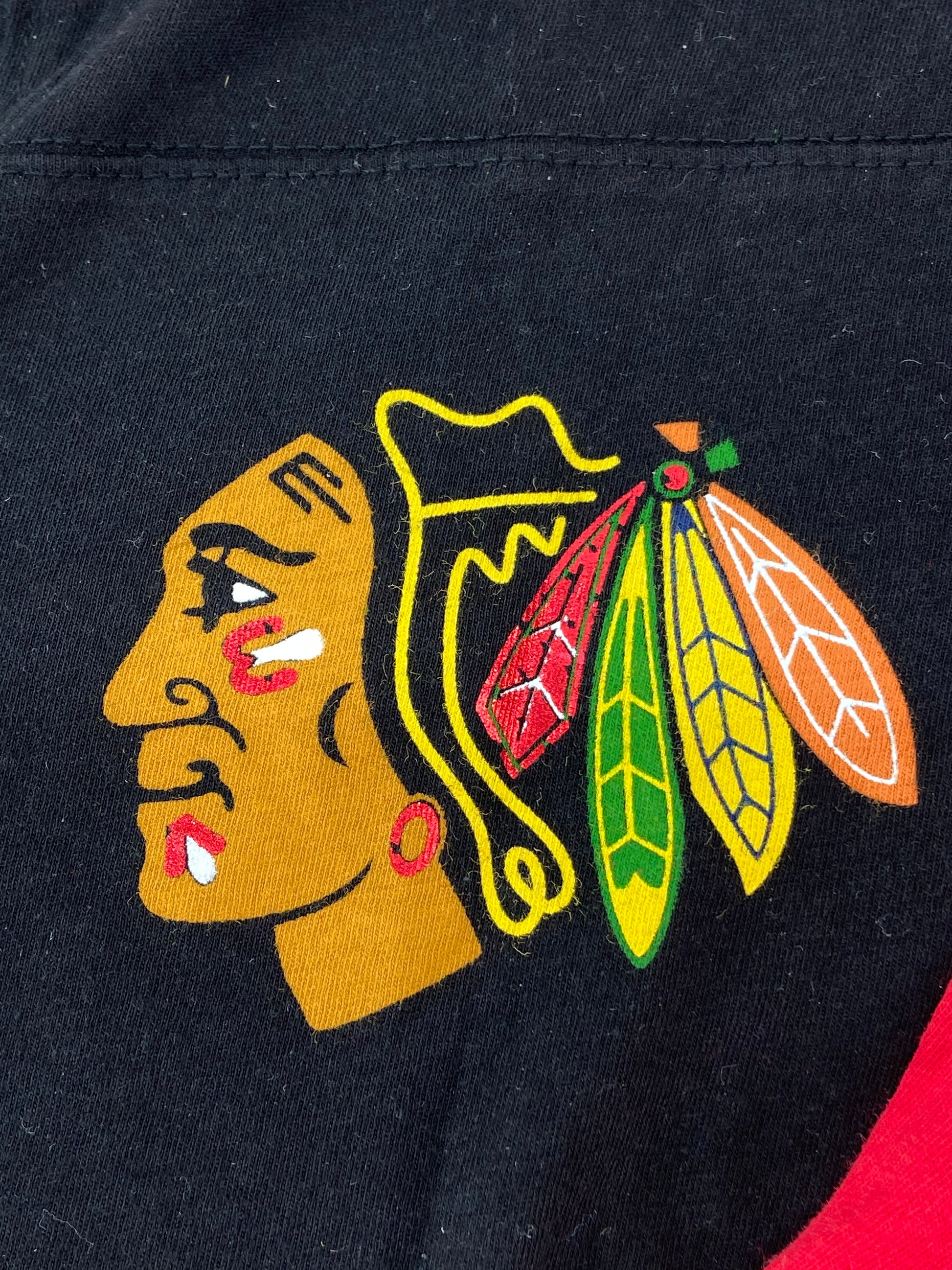 Check out this stylish NOS (New Old Stock) long-sleeve logo tee that is destined to be a hit for the lucky lady who receives it. Featuring the Blackhawks colors and the logo placed on the upper left chest, it's a great look to have at the next 'Hawks game, or simply as a great gift for that special someone. We measured 18" across the chest and 26" top to bottom, with 12" sleeves. The folks at Majestic know how to design women's clothes! 100% cotton and made in Nicaragua, with original tags.