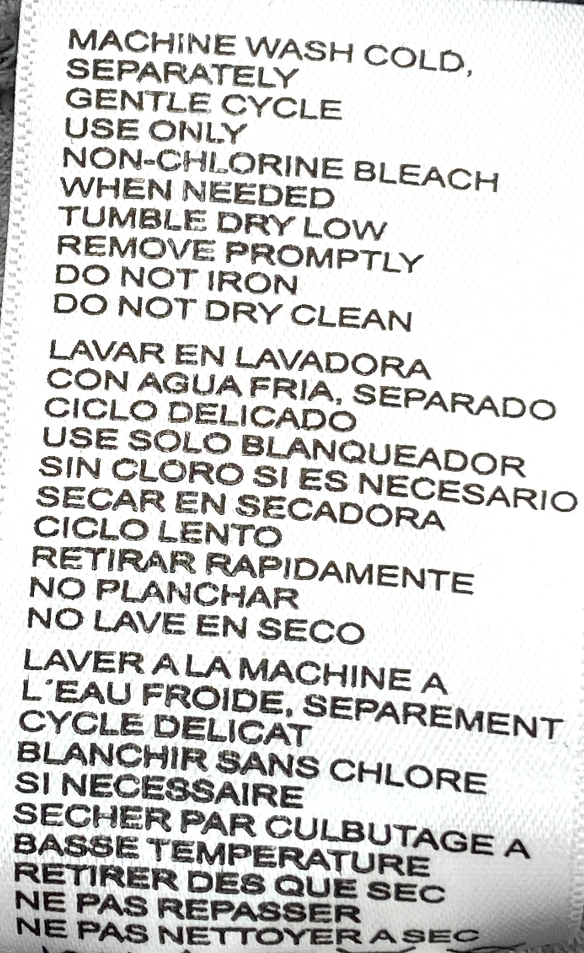 Care instructions: Machine wash cold, separately, gentle cycle -- Use only non-chlorine bleach when needed -- Tumble dry low, remove promptly -- Do not iron -- Do not dry clean --