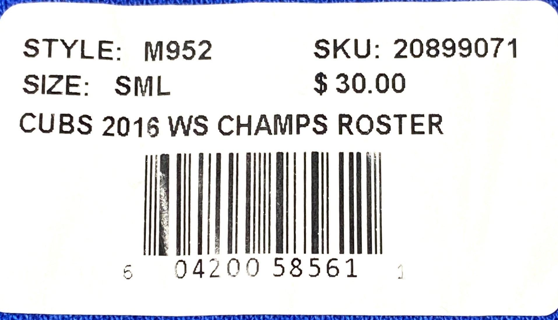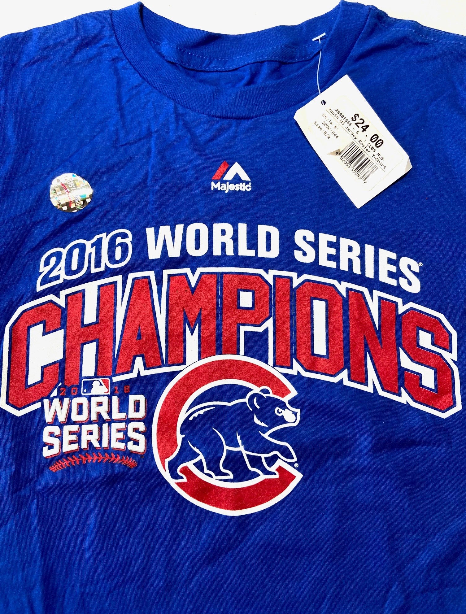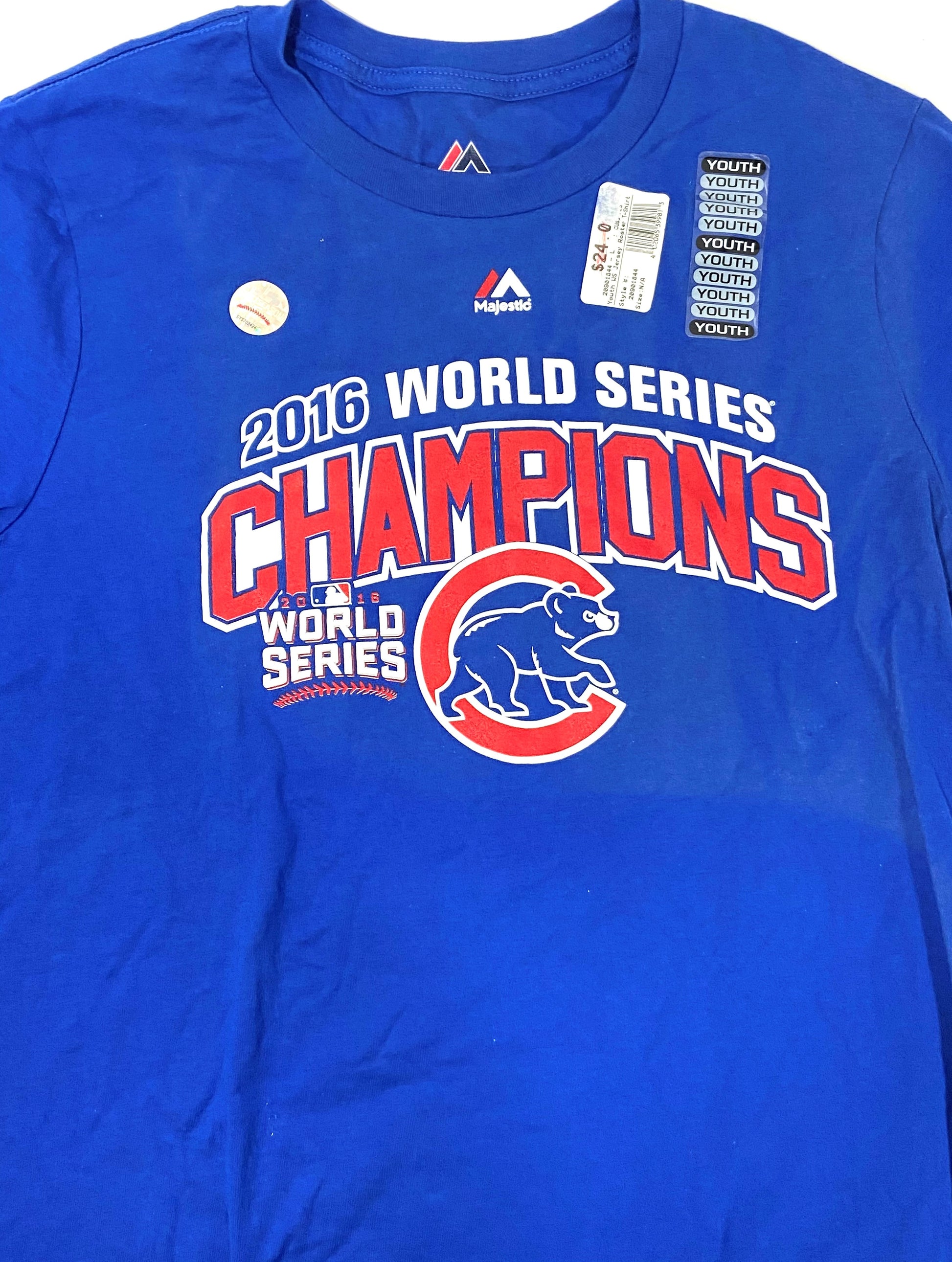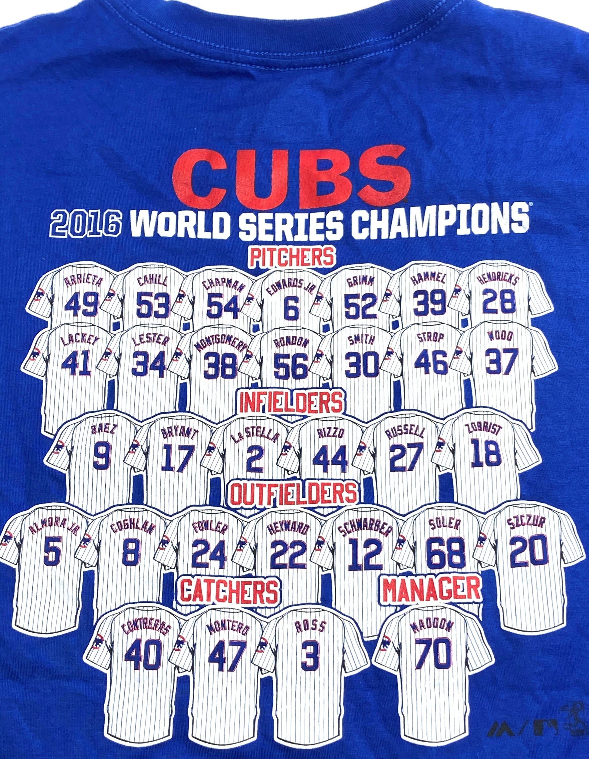Here's an awesome Cubs "World Series Champs" youth large t-shirt from Majestic that will get any youth size small (6-8), youth large (14-16) kid or adult small excited. It's 100% cotton, Cubbie Blue, and the roster design on the back is a real bonus. For a size check/comparison, the youth small is 15" across (armpit-armpit) and 22" from the back top of the neck to the bottom of the shirt, and the youth large shirt is 17 1/2" across and 24 1/2" from the neck to the bottom and was made in Mexico.