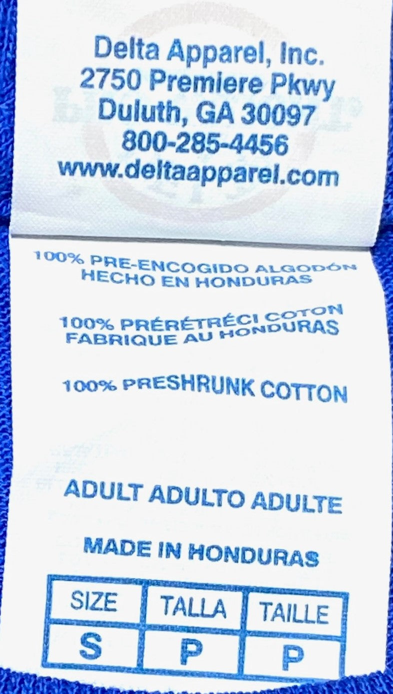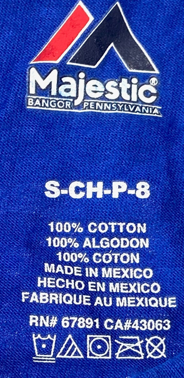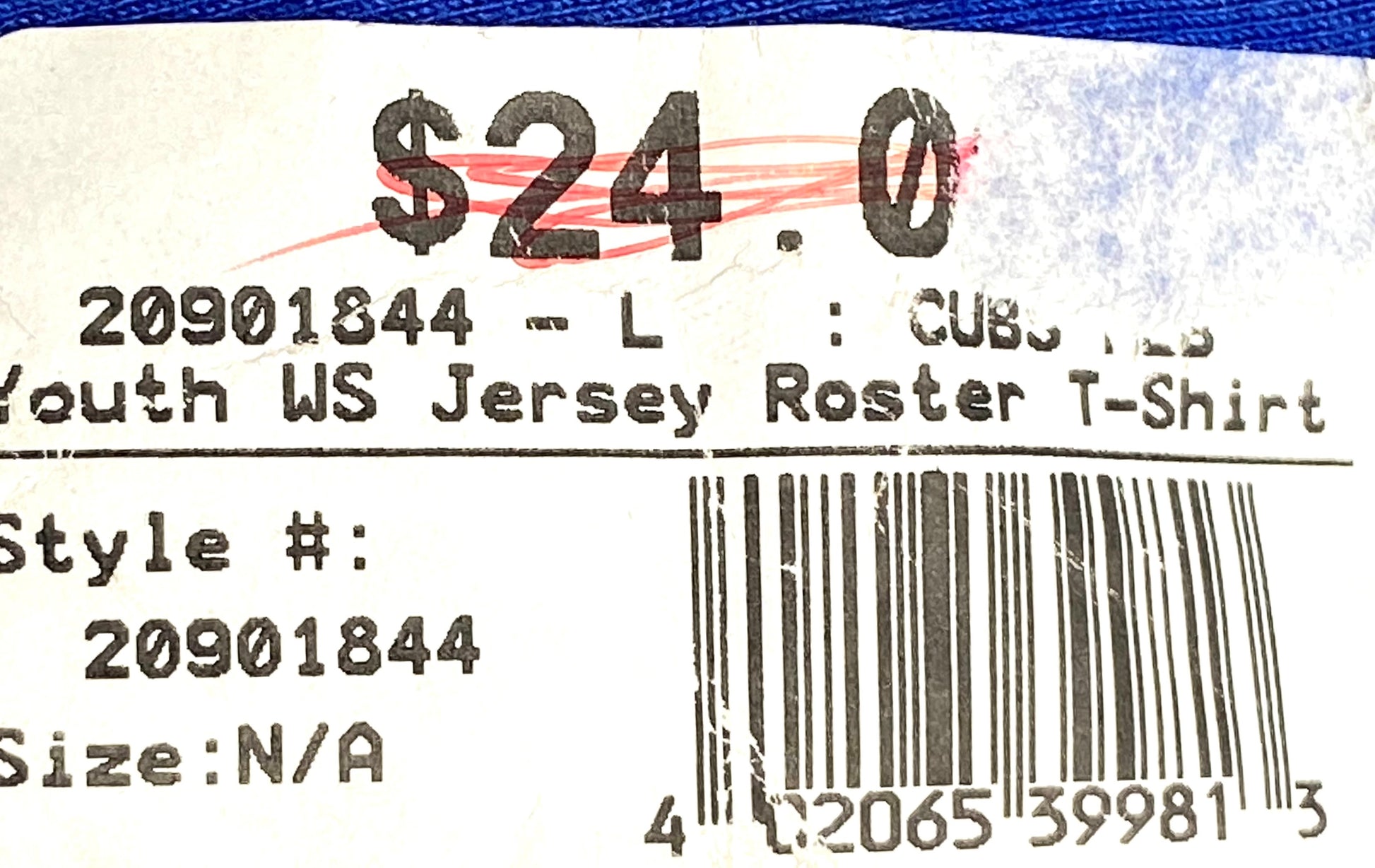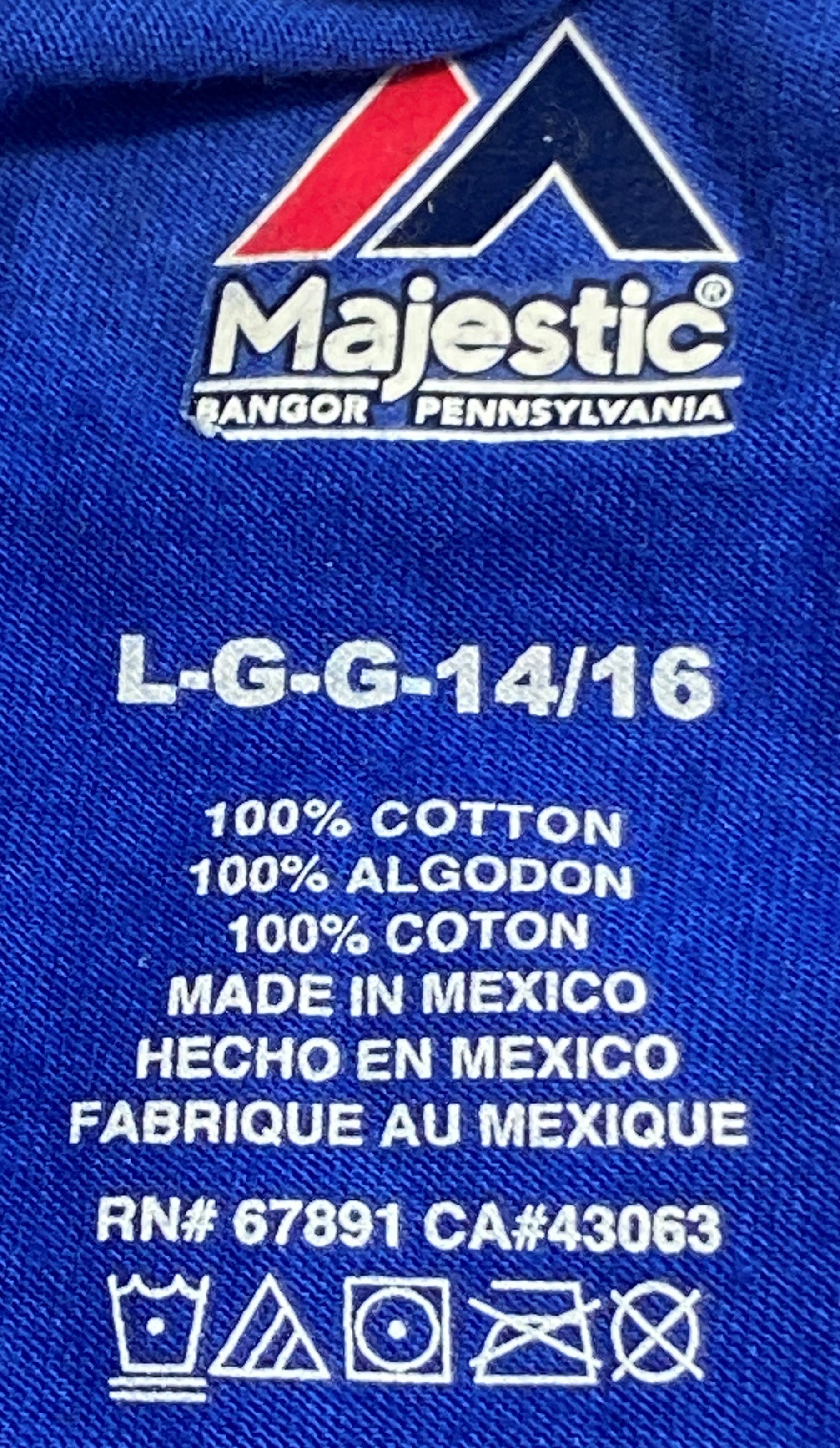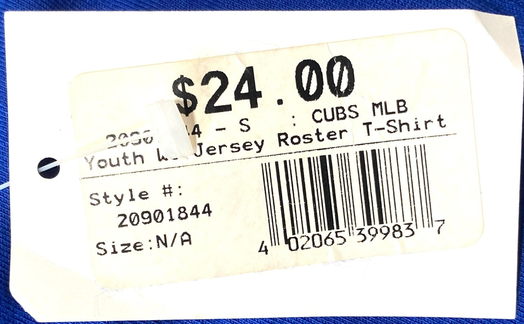 Here's an awesome Cubs "World Series Champs" youth large t-shirt from Majestic that will get any youth size small (6-8), youth large (14-16) kid or adult small excited. It's 100% cotton, Cubbie Blue, and the roster design on the back is a real bonus. For a size check/comparison, the youth small is 15" across (armpit-armpit) and 22" from the back top of the neck to the bottom of the shirt, and the youth large shirt is 17 1/2" across and 24 1/2" from the neck to the bottom and was made in Mexico.