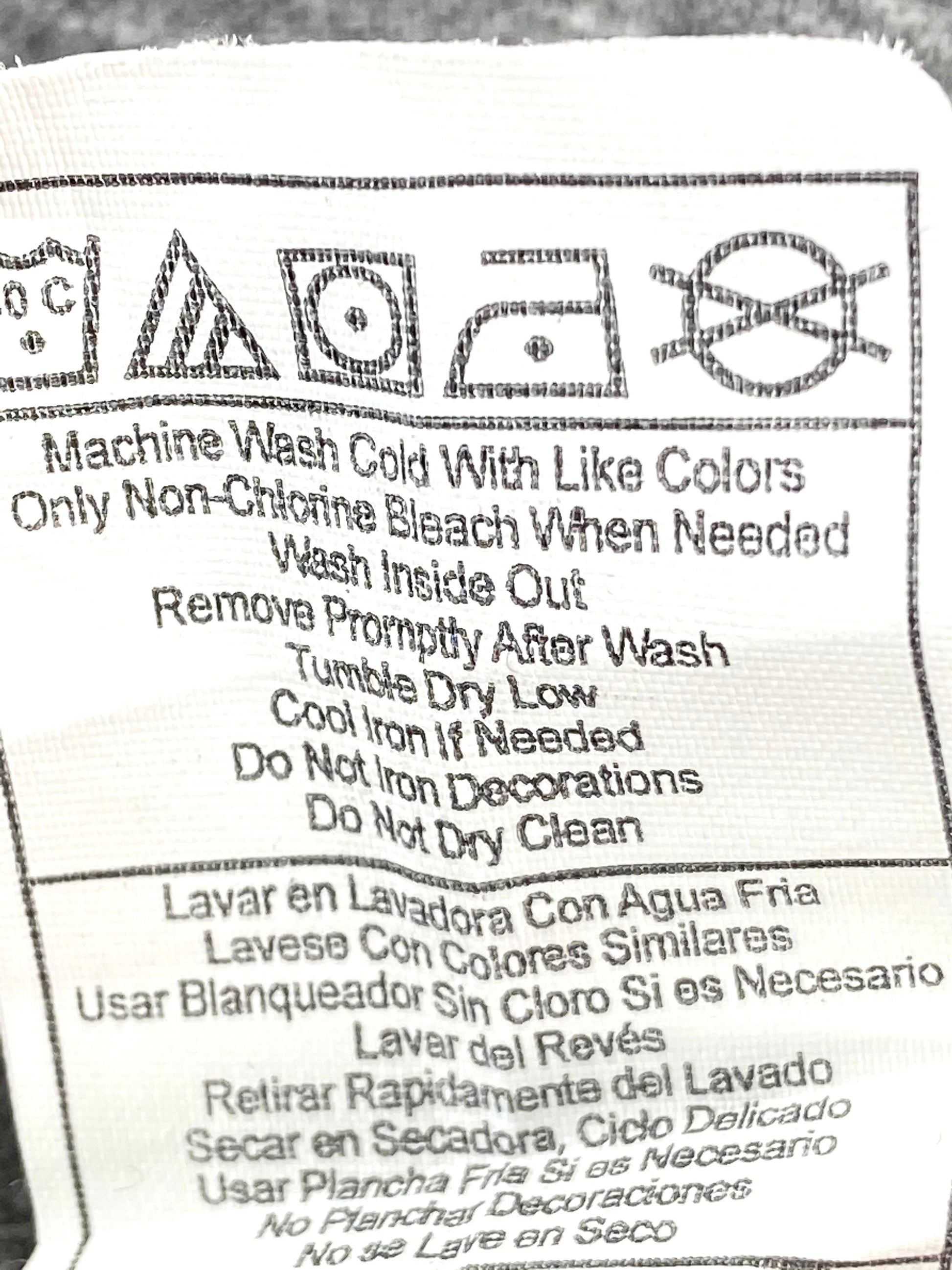 Care instructions: Machine wash cold with like colors -- Only non-chlorine bleach when needed -- Wash inside out -- Remove promptly after wash -- Tumble dry low -- Cool iron if needed -- Do not iron decorations -- Do not dry clean --