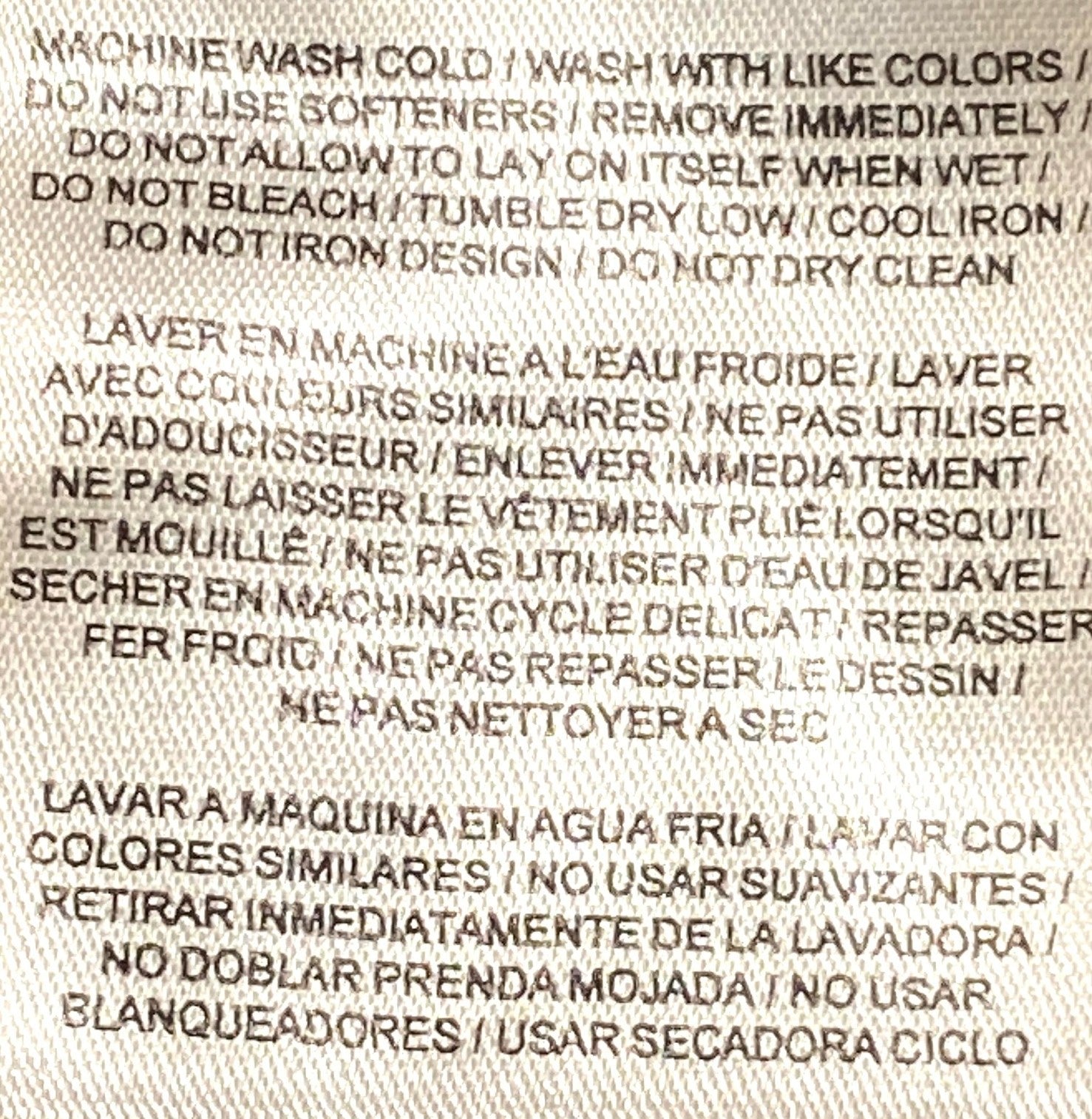 Care instructions: Machine wash cold -- Wash with like colors -- Do not use softeners -- Remove immediately -- Do not allow to lay on itself when wet -- Do not bleach -- Tumble dry low -- Cool iron -- Do not iron design -- Do not dry clean --