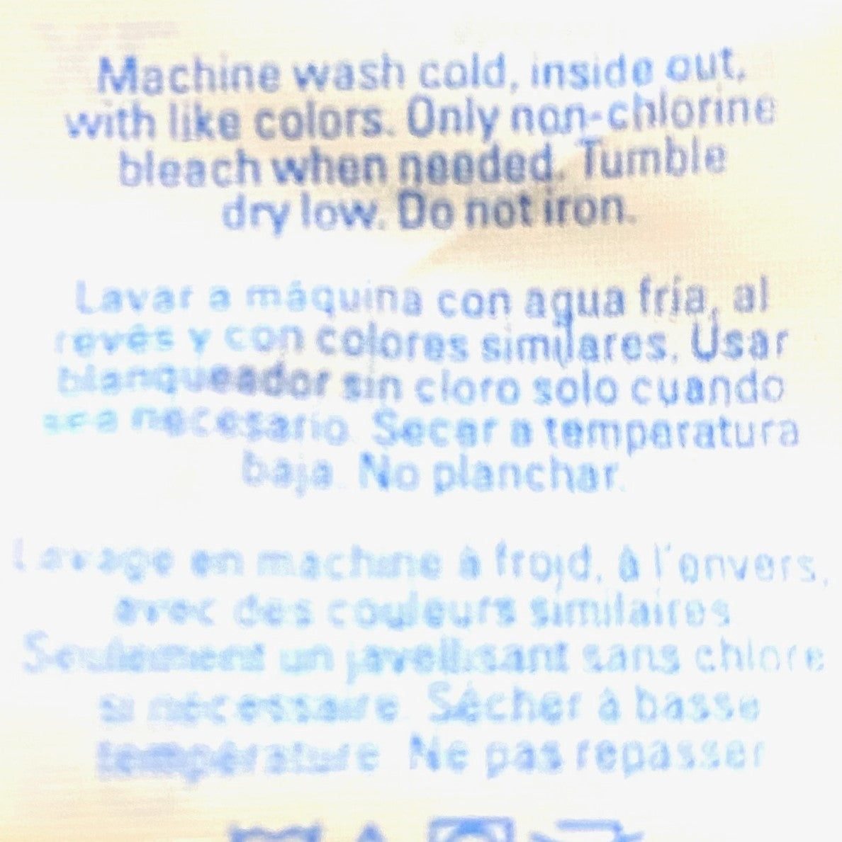 Care instructions: Machine wash cold, inside out, with like colors -- Only non-chlorine bleach when needed -- Tumble dry low -- Do not iron --