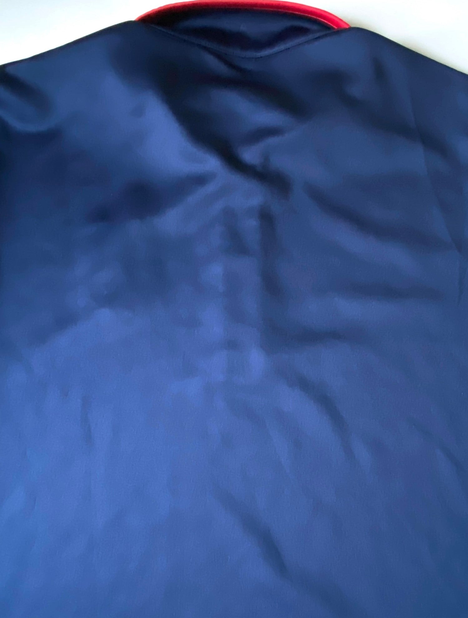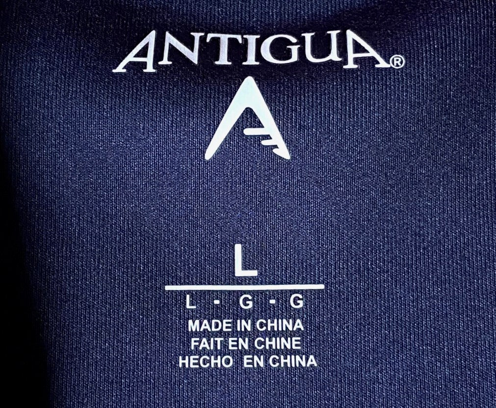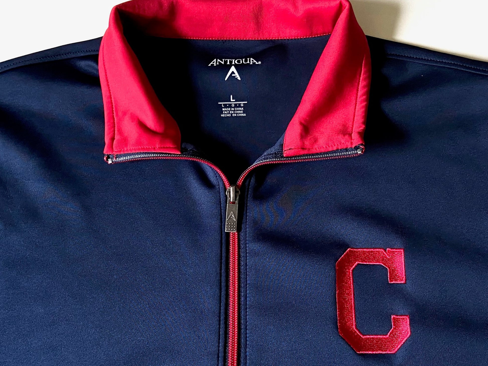 Here's a gently used Cleveland sweatshirt from 2012. It features the standard navy/red team color combination with a solitary block "C" on the left chest. This attractive sweatshirt is from Antigua (and they have a great reputation for making classy merchandise) and is 93% polyester and 7% Spandex. Check out the photos and see what you think. Note that the top of the right sleeve in the main photo appears lighter from the angle of the light source but rest assured this item is really excellent in every way -- no flaws! Made in China.