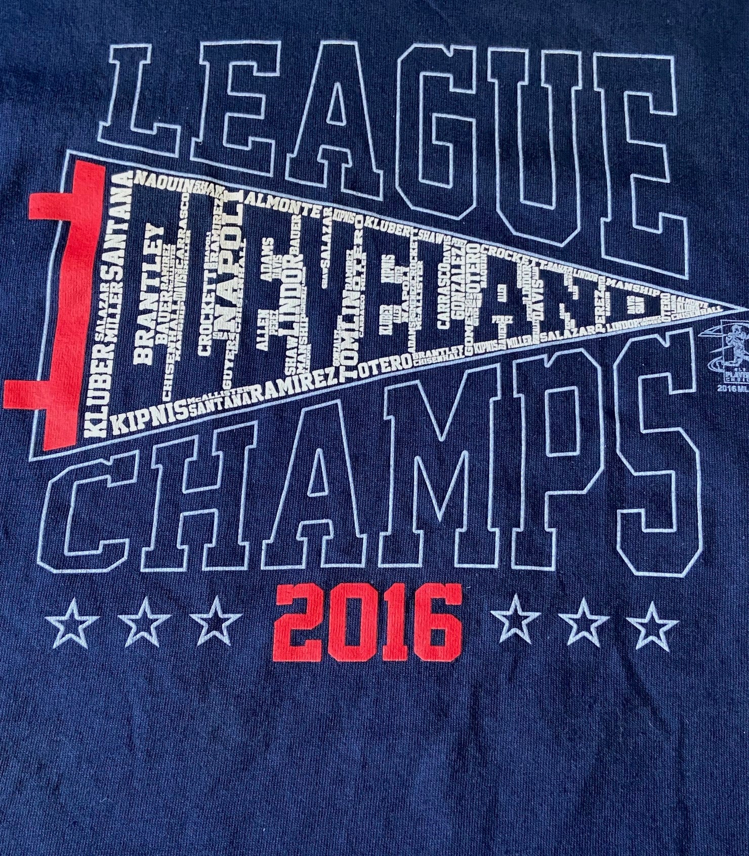 Here's a gently used T-shirt from the glory year (well, almost) of 2016. It was the year Cleveland had the Cubbies on the World Series ropes, up 3-1, and somehow managed to let the world championship slip from their grasp. This attractive gently used tee is 100% pre-shrunk cotton. Check out the photos and see what you think. Made in Honduras.