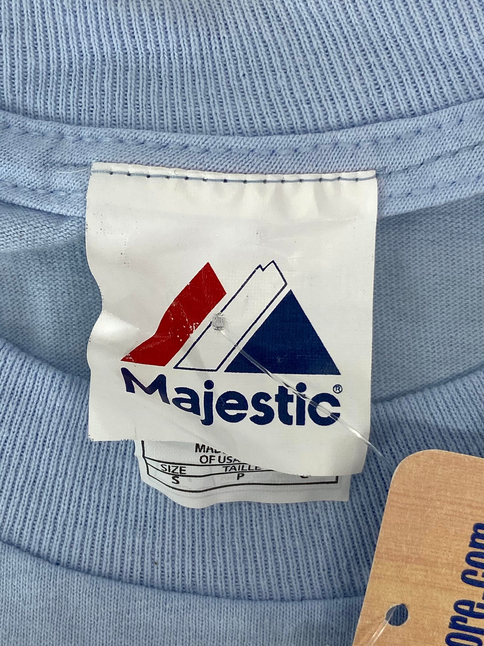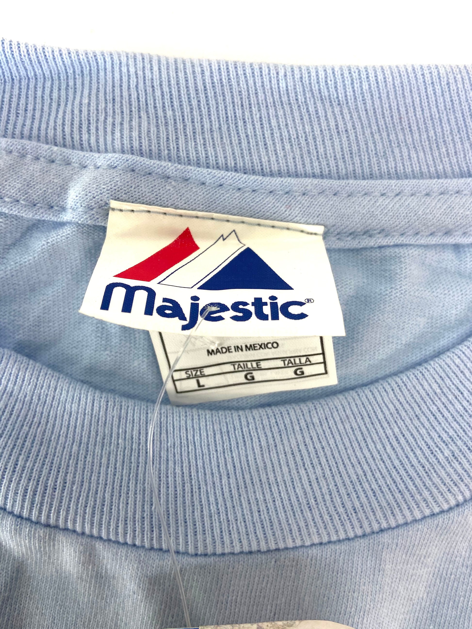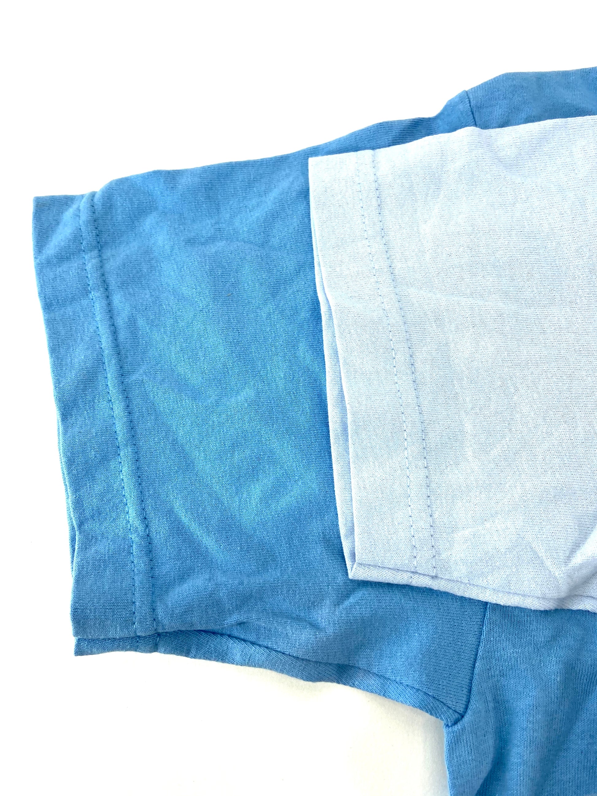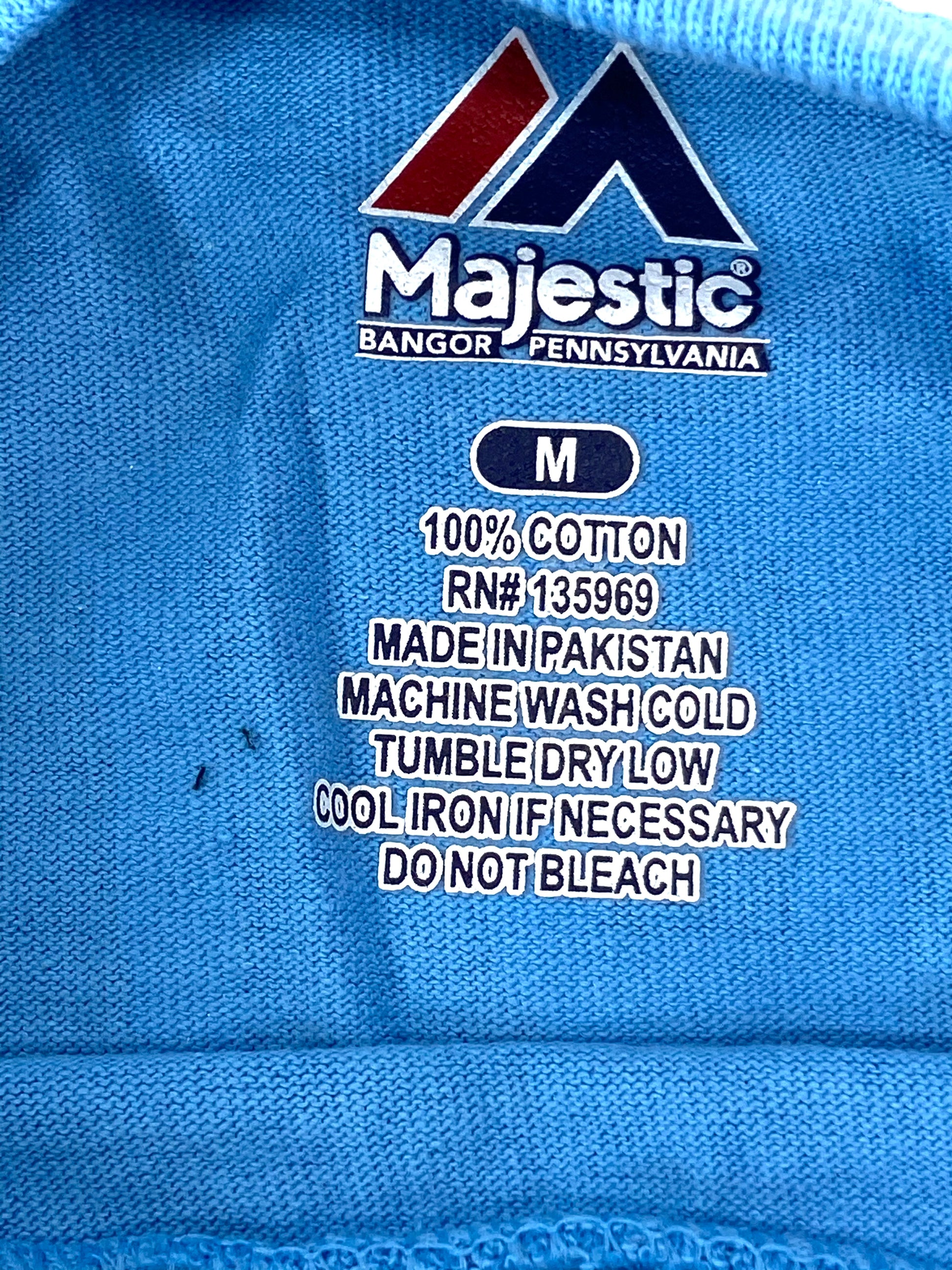 Regardless of where they were made, they have their original tags and are 100% cotton, and were originally $20.00. Check out the photos to determine which size suits you. Notice that one of the photos includes a pic of the lighter blue sleeve atop the darker blue one for a more distinct contrast/comparison. Whichever you choose, you'll like the t-shirt.