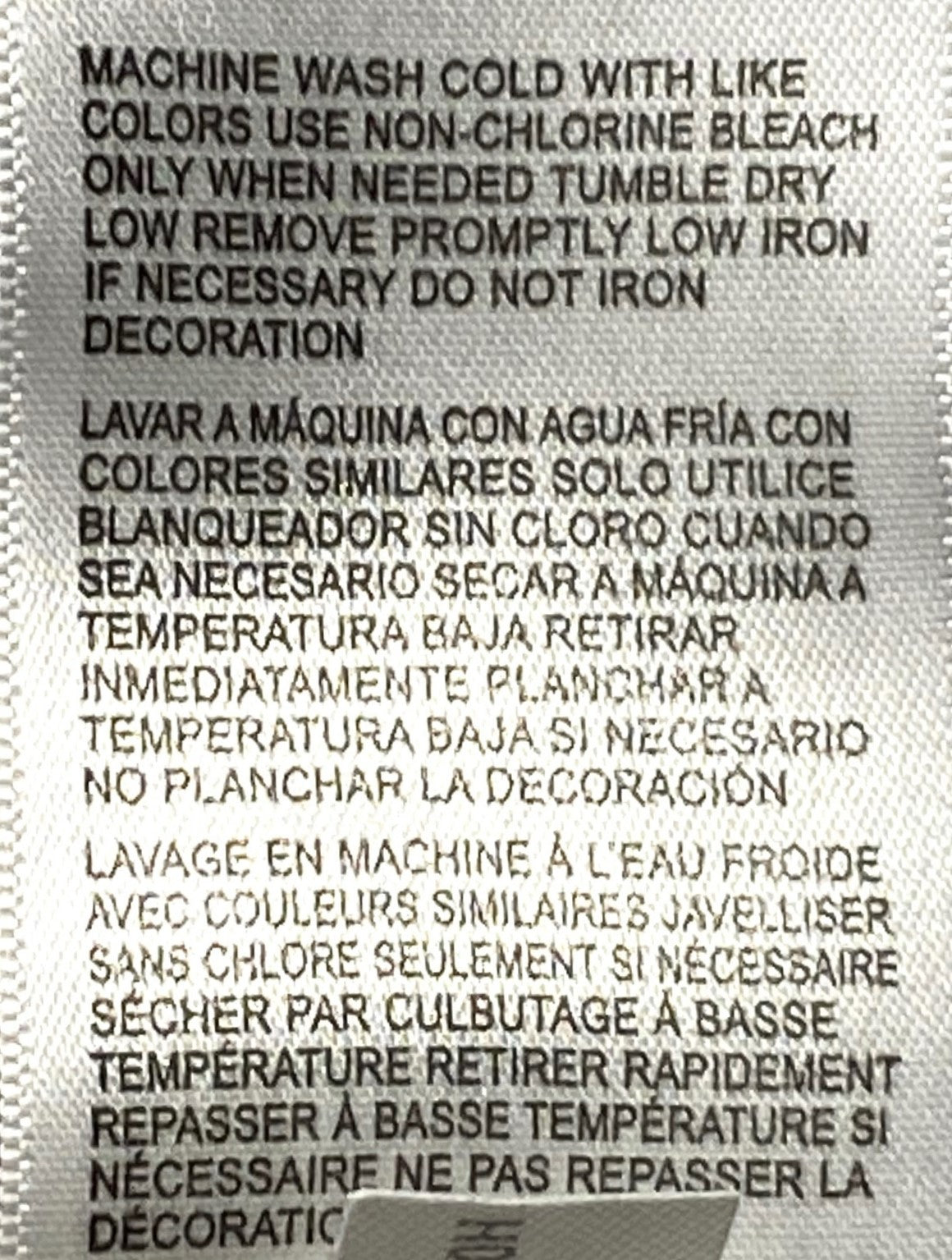Care instructions: Machine wash cold with like colors -- Use non-chlorine bleach only when needed -- Tumble dry low -- Remove promptly -- Low iron if necessary -- Do not iron decoration --