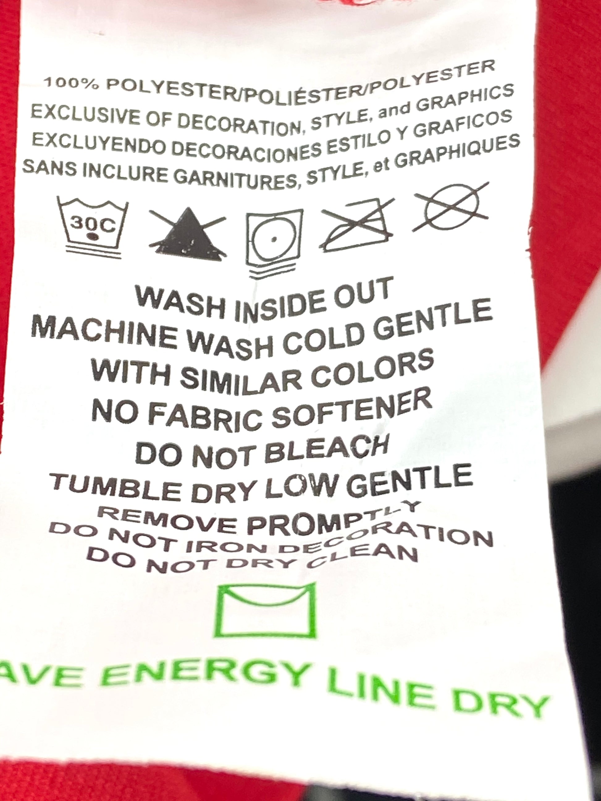 Care instructions: Wash inside out -- Machine wash cold with similar colors -- No fabric softener - Do not bleach -- Tumble dry low gentle -- Remove promptly -- Do not iron --