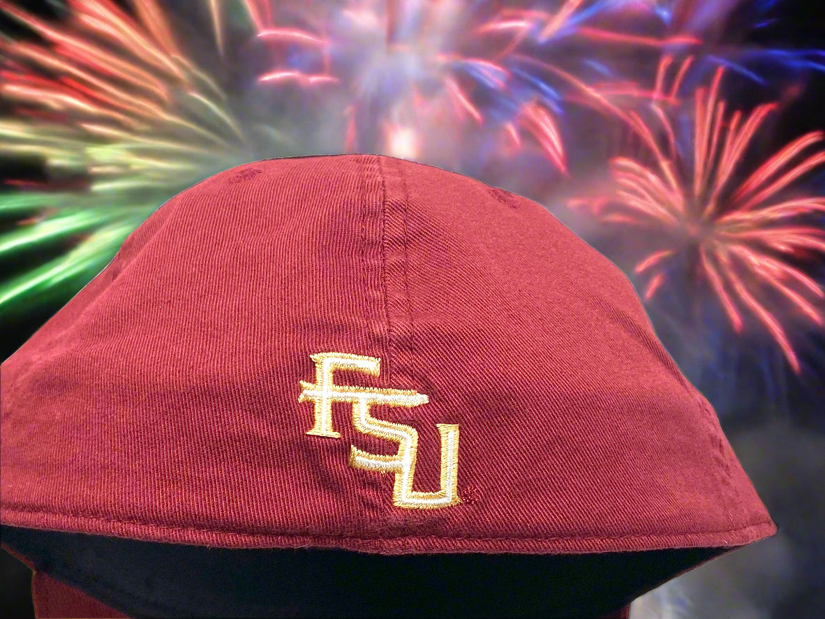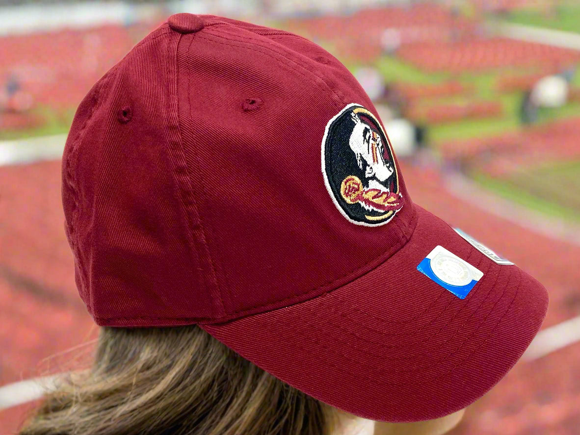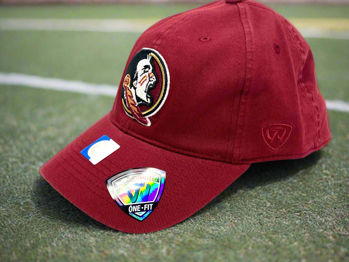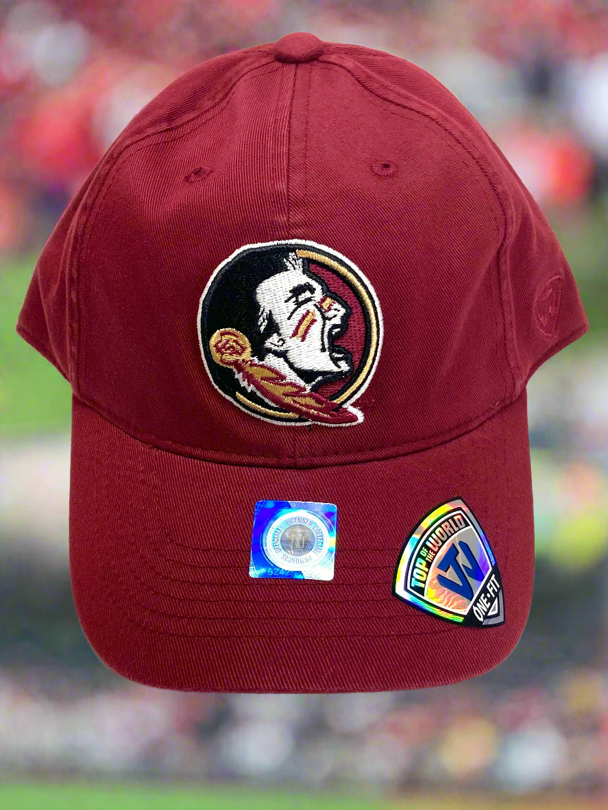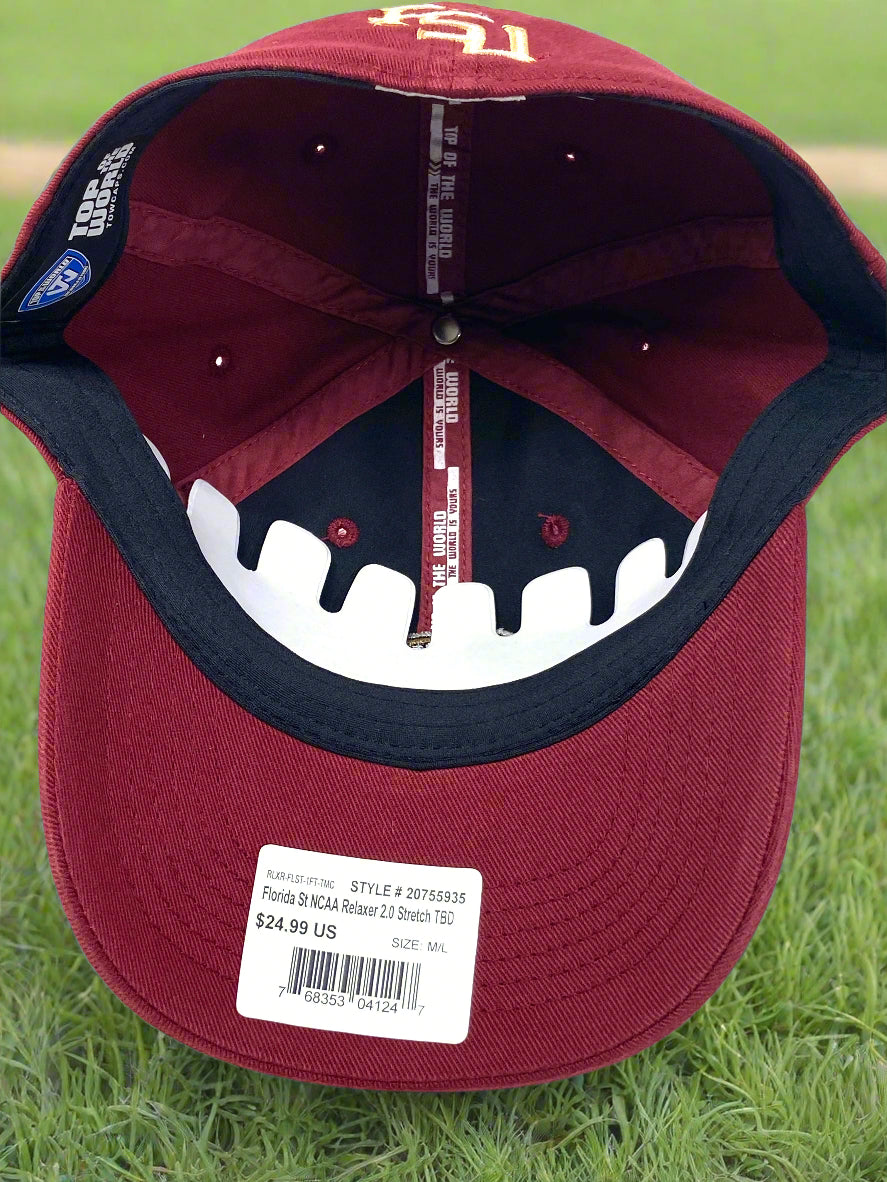Top of the World came through again -- big-time -- with this excellent Florida State Seminoles cap. Team colors and a "One Fit" Med/Large, you're going to love this NOS treasure. It's 97% cotton and 3% Spandex, and the "relaxer" has all its stickers. Bangladesh.