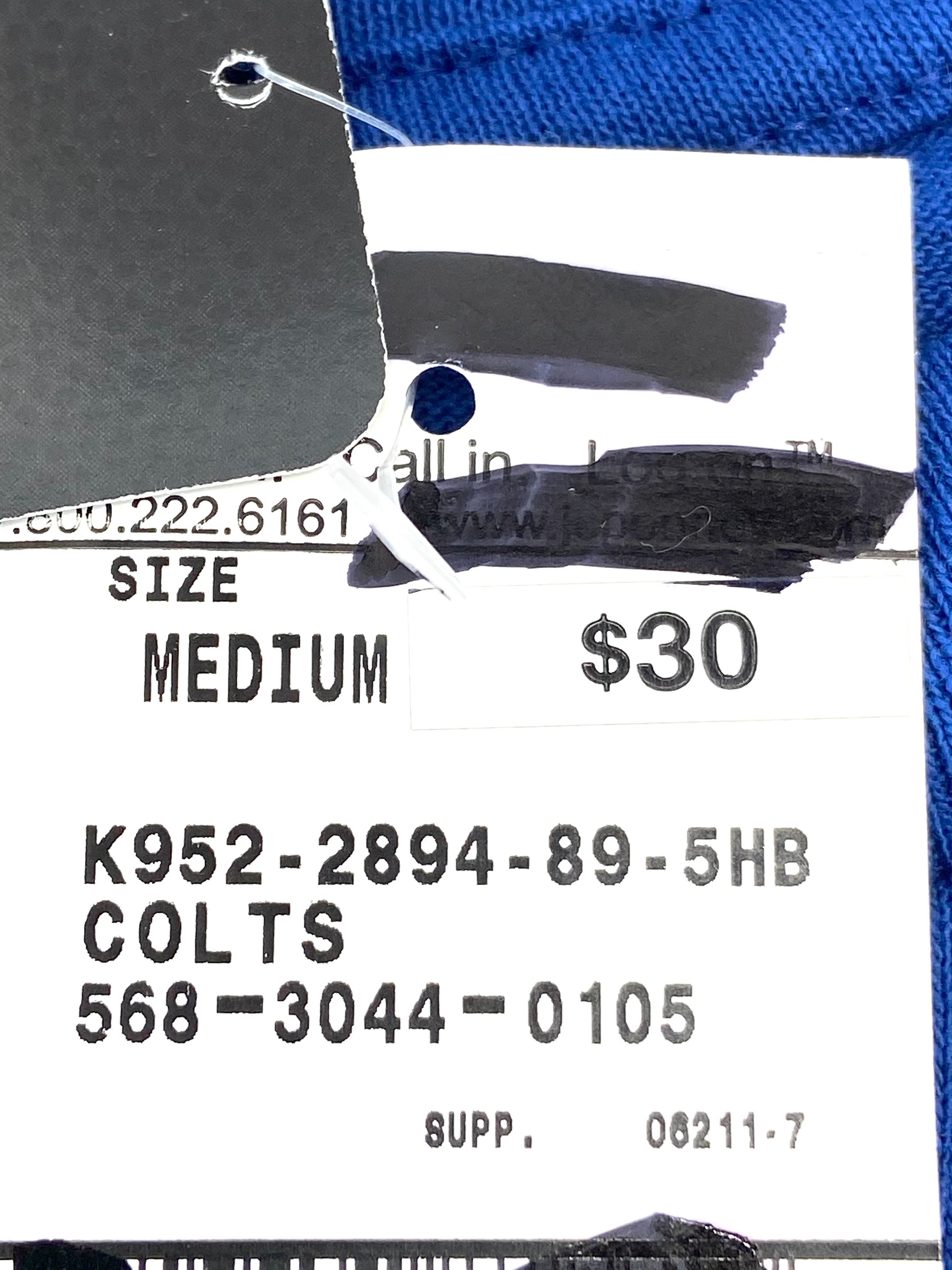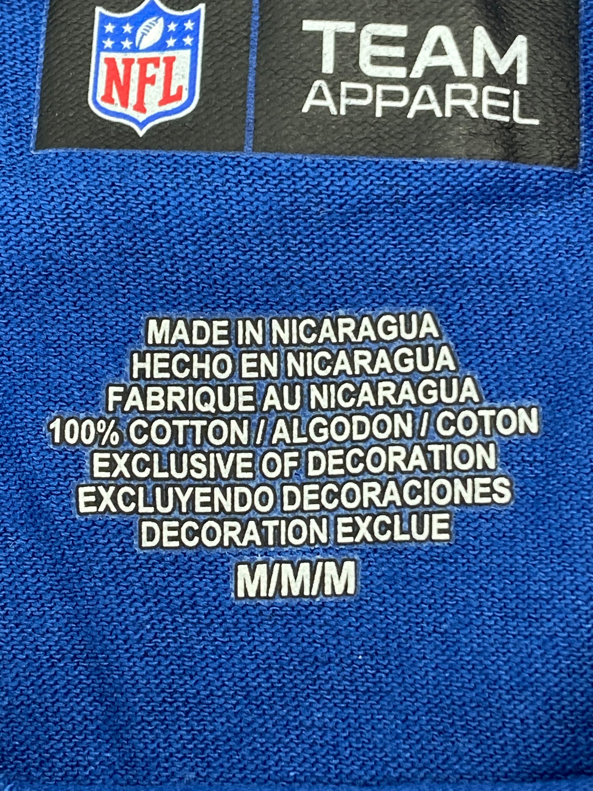 Here's a great NOS (New Old Stock) team color tee shirt that's sure to please any Colts fan (at least, any Colts fan that wears size Medium). Complete with "Colts" as well as the horseshoe logos, you will proudly (but perhaps not smartly) roam the mean streets of Indianapolis without fear. Made in Nicaragua, it's 100% cotton and has its original tags/stickers. For checking the tee shirt size against your own, the armpit to armpit measurement is 19" and from the top of the rear neck to the bottom of the tee it measures 27 1/4".