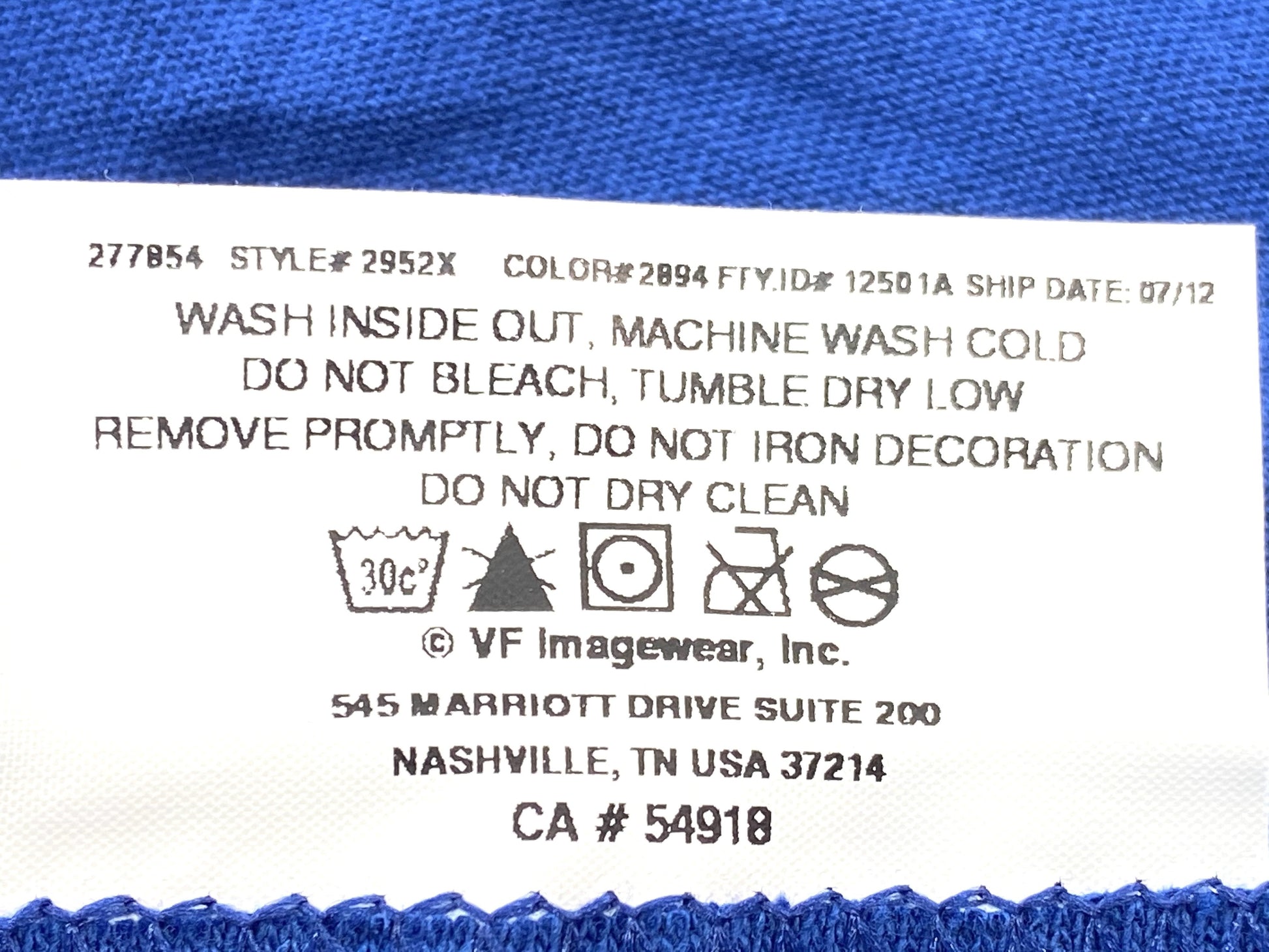 Care instructions: Wash inside out -- Machine wash cold with similar colors -- Do not bleach -- Tumble dry low -- Remove promptly -- Do not iron decoration -- Do not dry-clean --