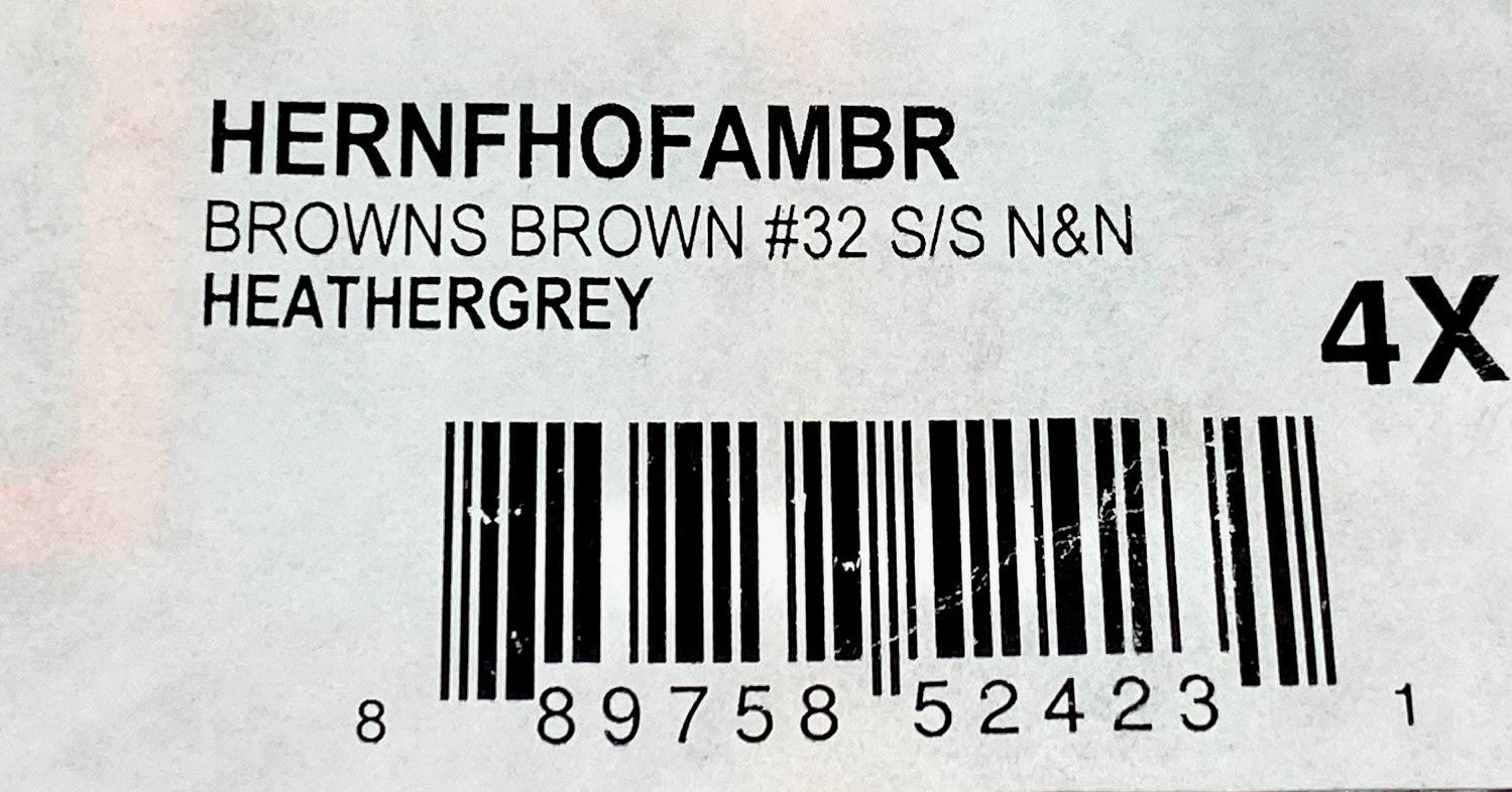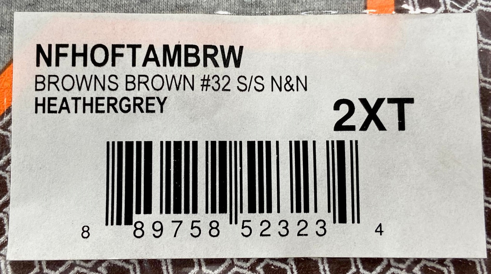Okay, Browns fans, men and women alike, especially men and women who usually shop big and tall. If you are a Jim Brown fan we have something you may be interested in: A Jim Brown/Cleveland Browns jersey t-shirt with Brown's name and number not only on the front of the tee, but on the back as well! At the bottom of this listing are the measurements we obtained, the first number being the armpit-to-armpit number in inches, and the second number indicating the measurement from the top of the back of the neck to the bottom of this NOS (New Old Stock) t-shirt. This should be helpful in determining what your best choice is. Peruse the photos and get ready to order! Pakistan. (2XLT Bangladesh)