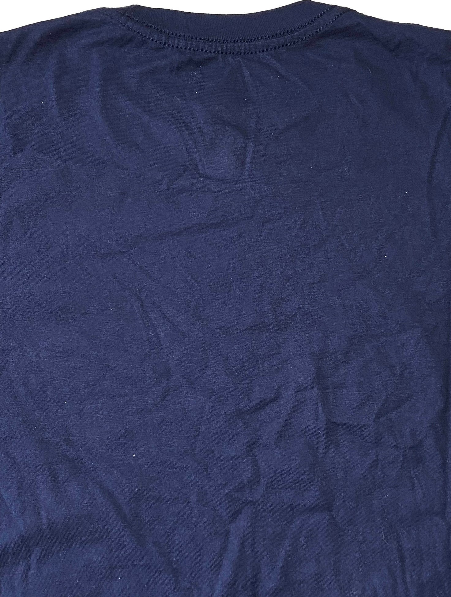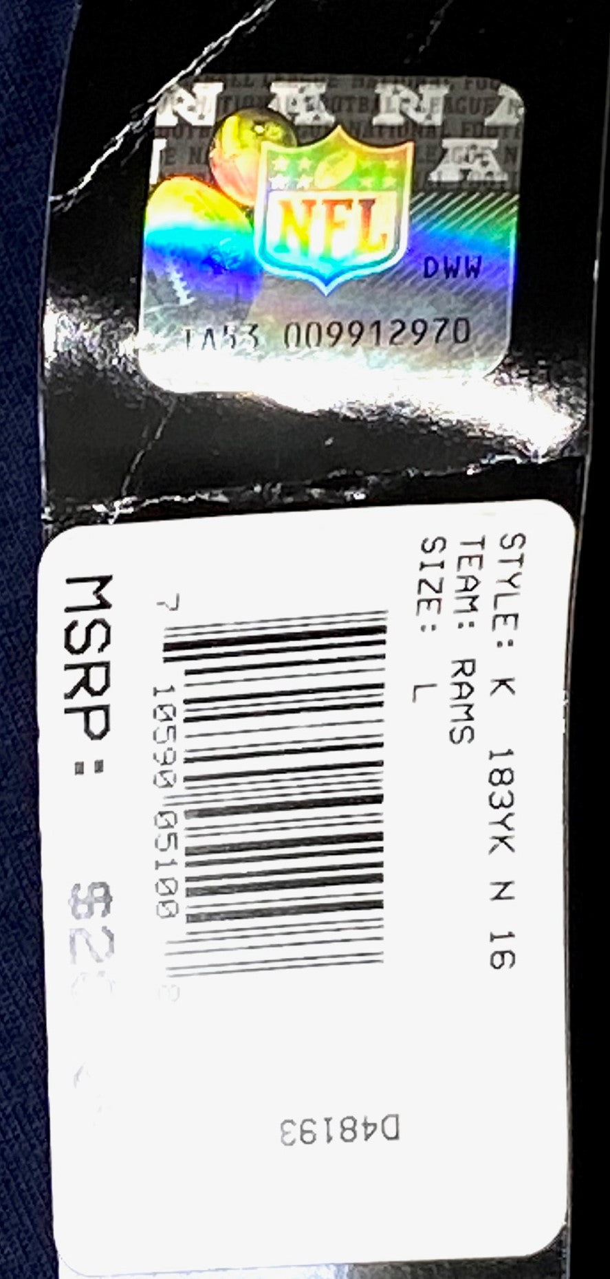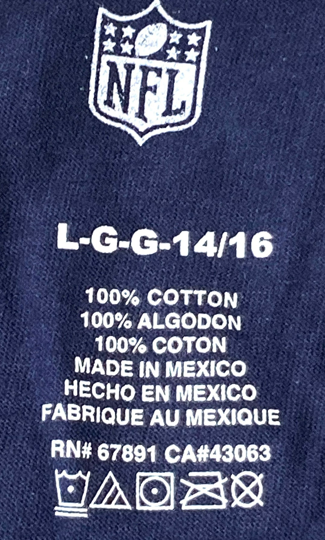 Here's a great "vertical print" tee shirt that's sure to please any youth Rams fan (at least, any Rams fan that wears size Large (14-16)). Complete with the Rams logo, you will proudly roam the mean streets of Los Angeles without fear 'cause you're rockin' your Rams gear. Made in Mexico, it's NOS (New Old Stock), 100% cotton, and has the original tags/stickers. For checking the tee shirt size against your own, the chest measurement is 18" and from the top of the neck to the bottom of the tee it measures 25". Check out the photos.