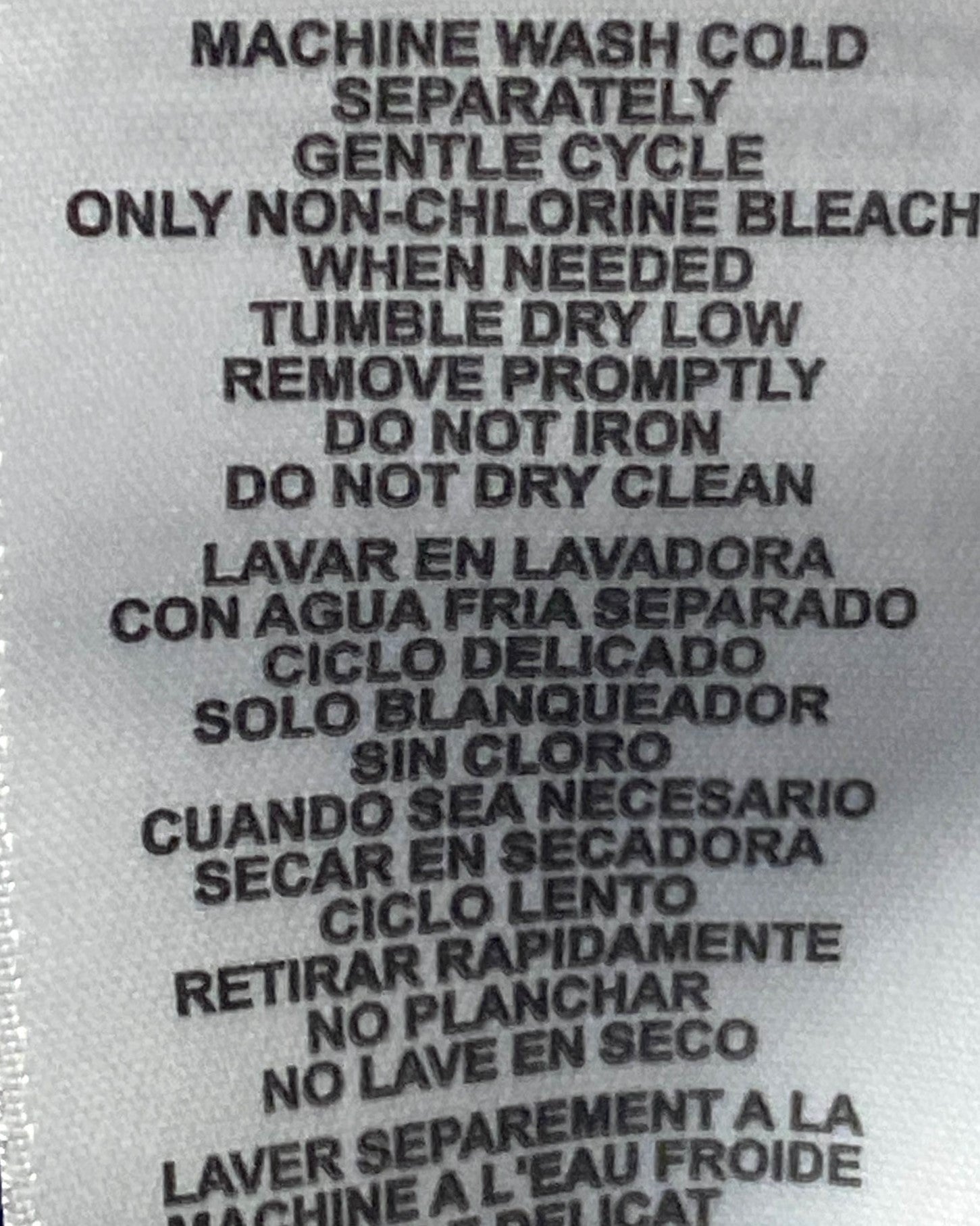 Care instructions: Machine wash separately -- Gentle cycle -- Only non-chlorine bleach when needed --Tumble dry low --Remove promptly --Do not iron -- Do not dry clean --