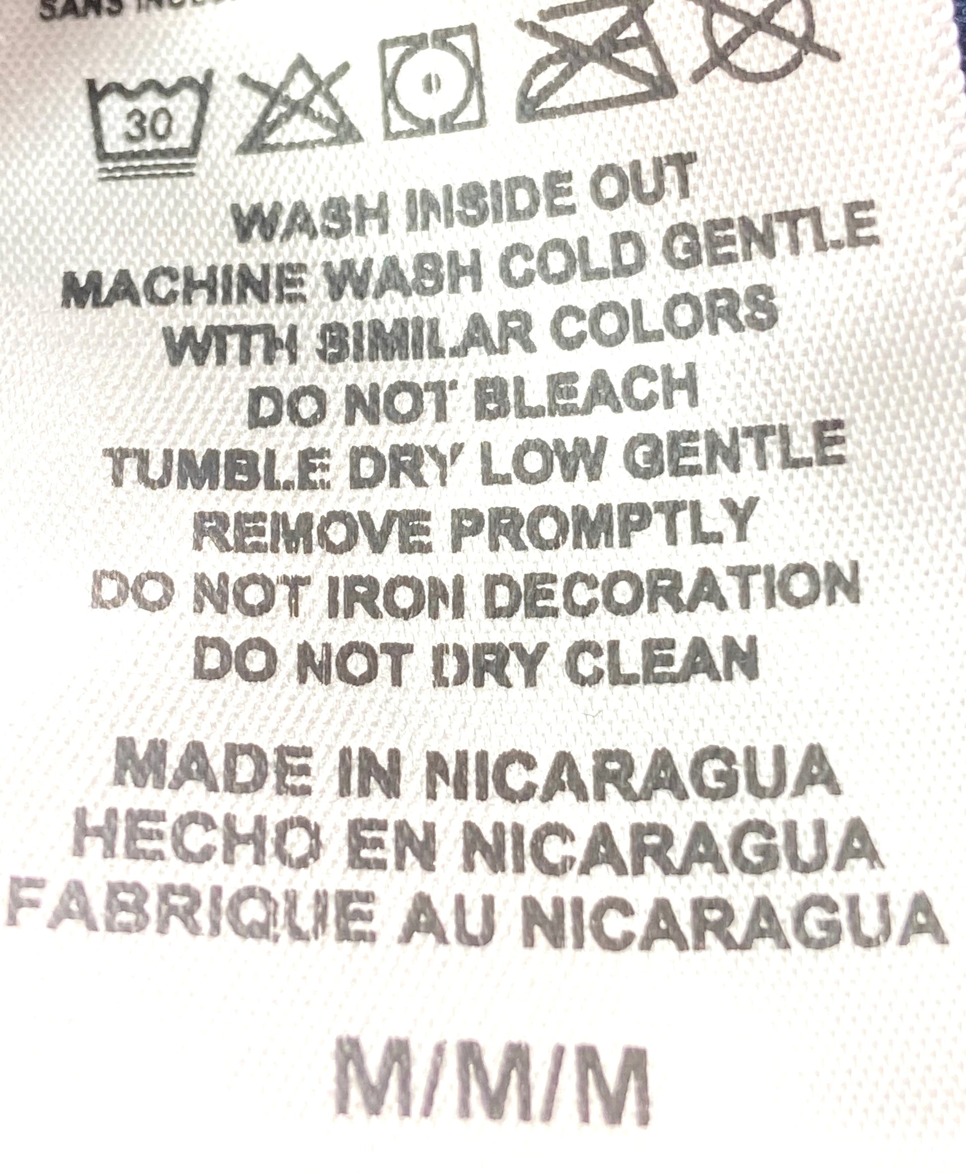 Care instructions: Wash inside out -- Machine wash cold gentle with similar colors -- Do not bleach -- Tumble dry low gentle -- Remove promptly -- Do not iron decoration -- Do not dry clean --