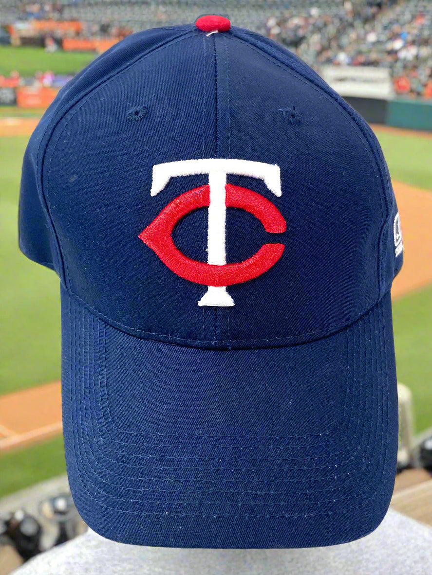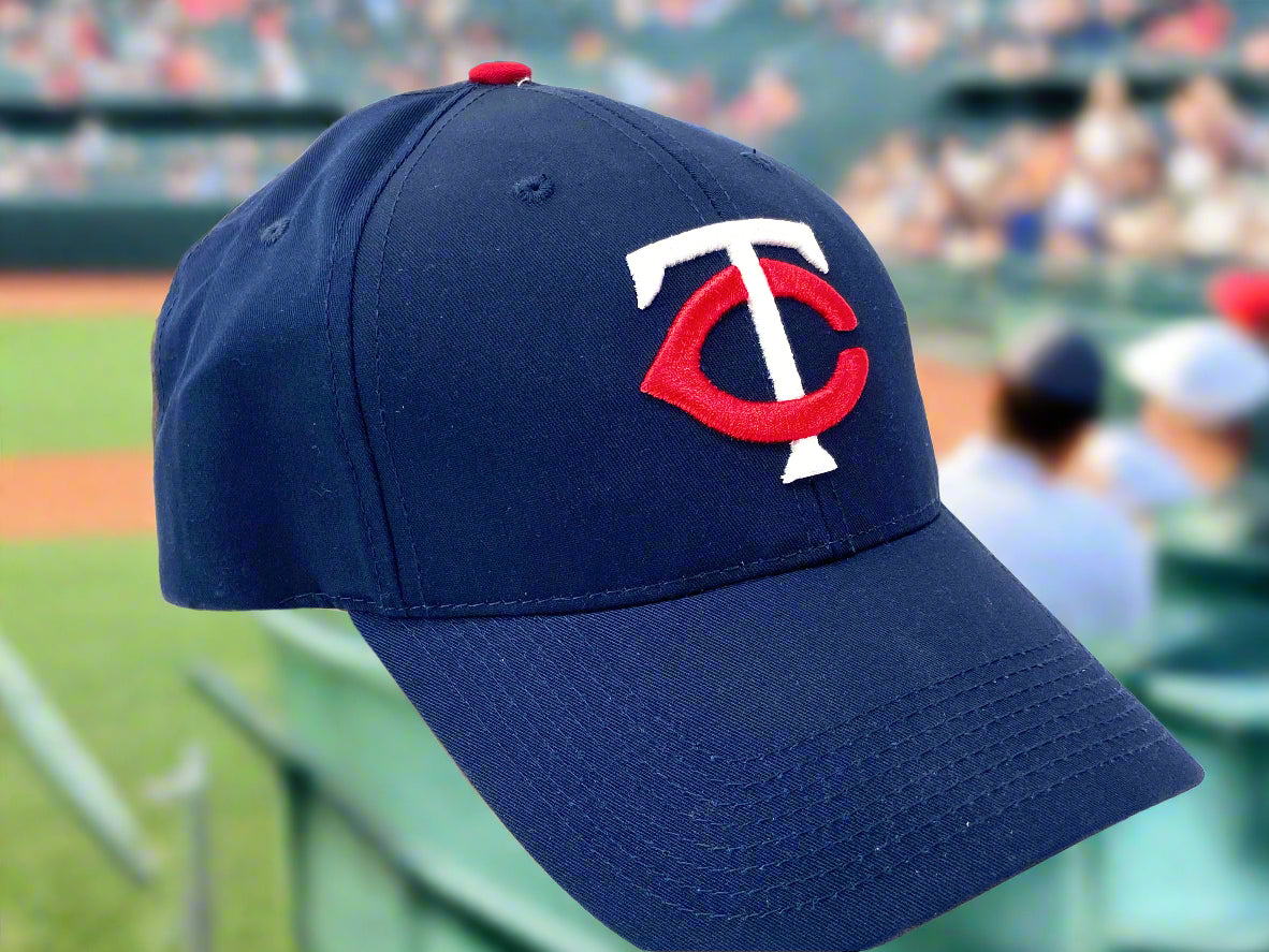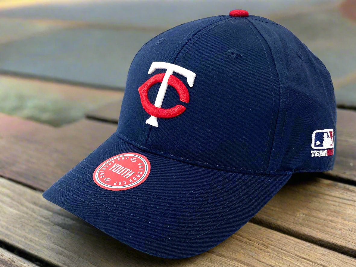 These are the Twins MLB-275 youth home replica caps made by Outdoor Cap -- American League version. The only difference between these and the MLB-300 caps is these have a curved bill. The 300s are flat, but it is easy to curve the bill to your taste if so desired. These...not so much. It's pretty difficult to flatten a pre-curved bill (and expect it to stay flattened); just an FYI. Otherwise, the NOS 275s are essentially the same cap as the 300s: Polyester/cotton twill, made in Bangladesh or China, with hook and loop closure and exceptional embroidery. Outdoor Cap decided it was more cost-effective to only make one cap that could go flat or curved rather than gear up for two different bills. Personally, we prefer the curved bills, but then ...who asked us? Since these have been discontinued, we have considerably fewer of these than the 300s...