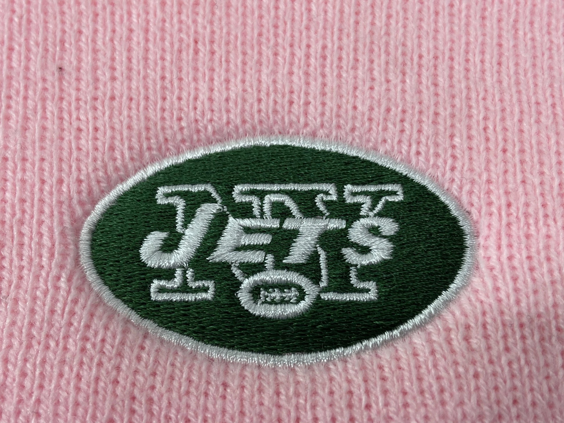 How about this awesome licensed pink cuffed NOS (New Old Stock) knit cap for the ladies? It's OSFA, 100% turbo acrylic, and made by Yupoong. Yes, it's pink, but still has the Jets colors and logo. It also has its original tags and was manufactured in China. It makes those chilly games in the winter not quite as nasty. Let us rehash the features of this fine knit hat: