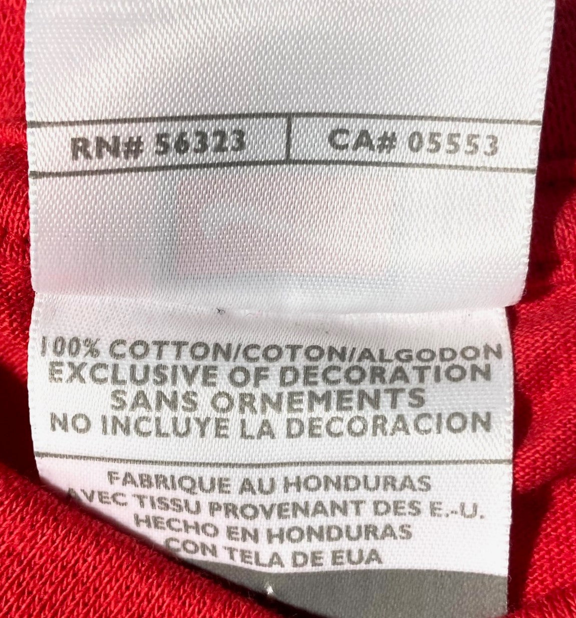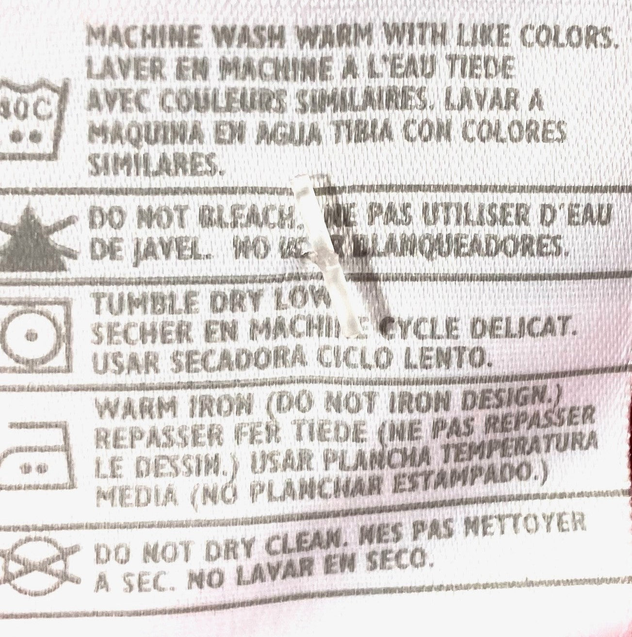Care instructions: Machine wash warm with like colors -- Do not bleach -- Tumble dry low -- Warm iron (do not iron design) -- Do not dry clean --