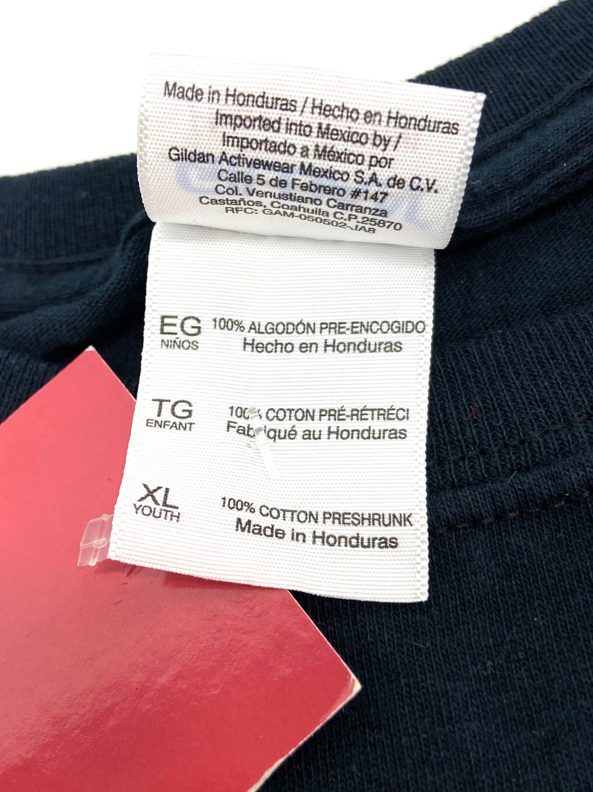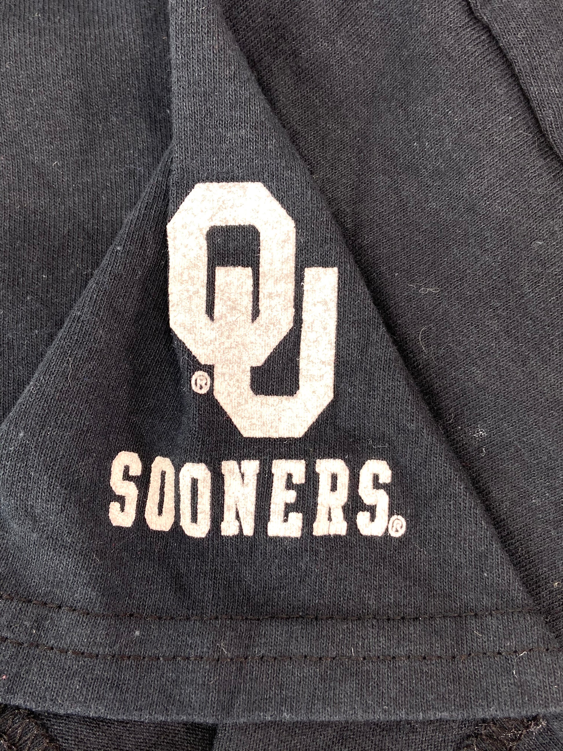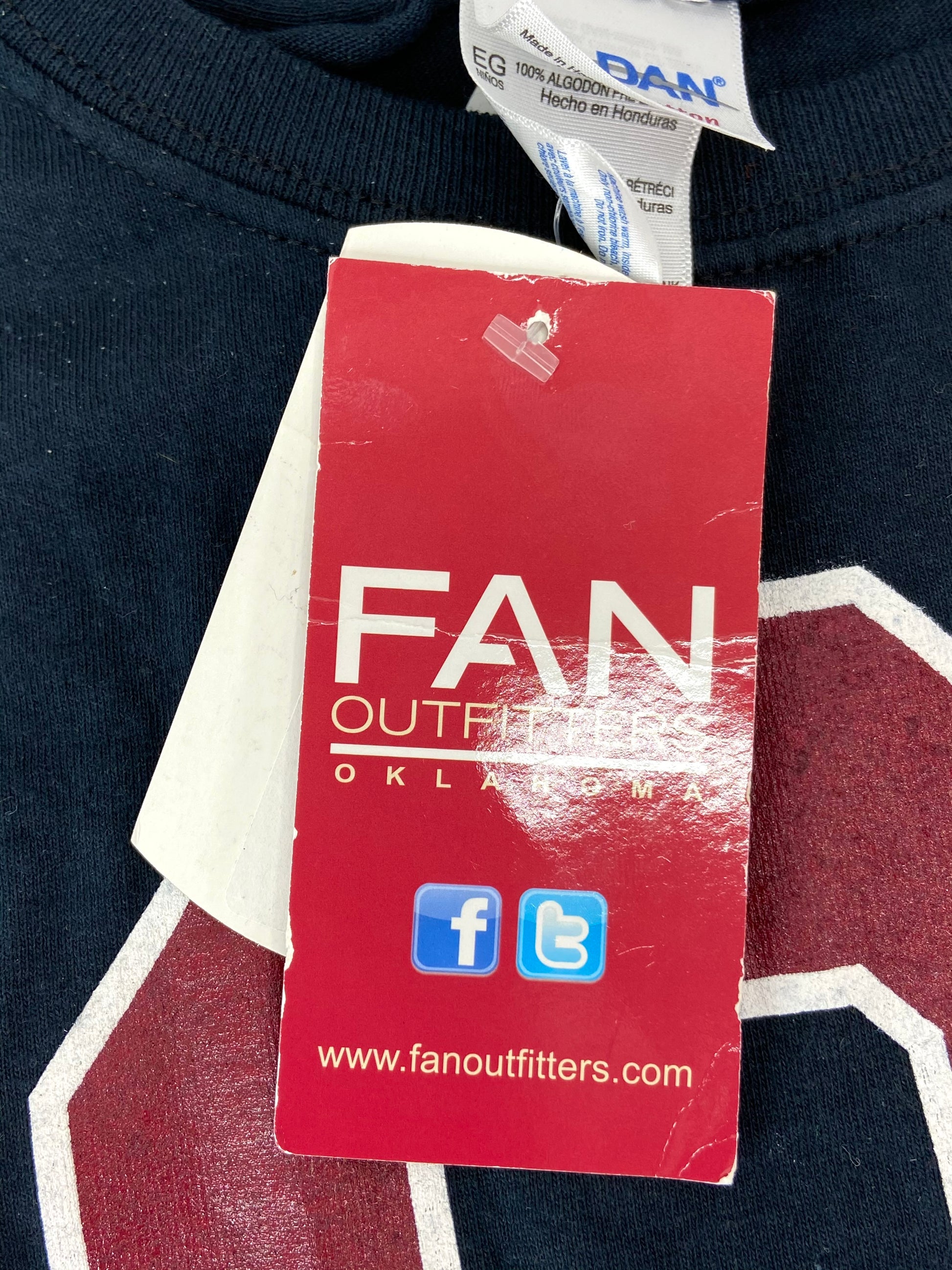 Here's a great Youth XL (18-20) NOS (New Old Stock) t-shirt from Fan Outfitters that will make any Sooner fan proud (providing they wear this size). This shirt is 100% preshrunk cotton with one of the larger logos you will see on the chest (which looks great against the black backdrop, BTW). Made in Honduras, this was originally priced at $25.00. We measured 17" across the chest and 23" top-to-bottom to assist you in determining if this size will work. Because that's how we roll.