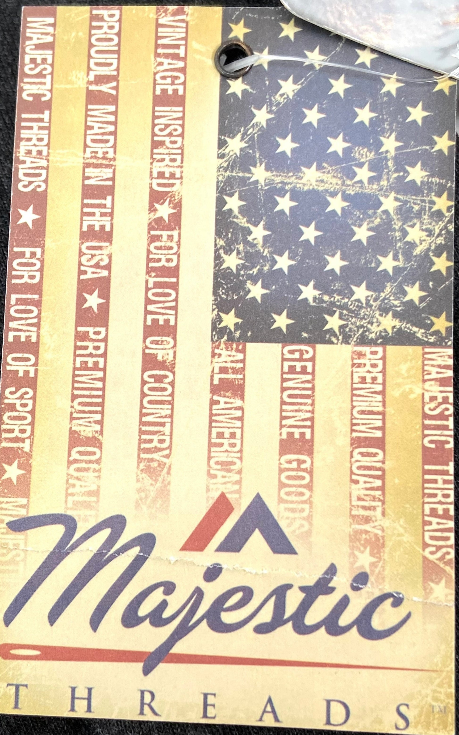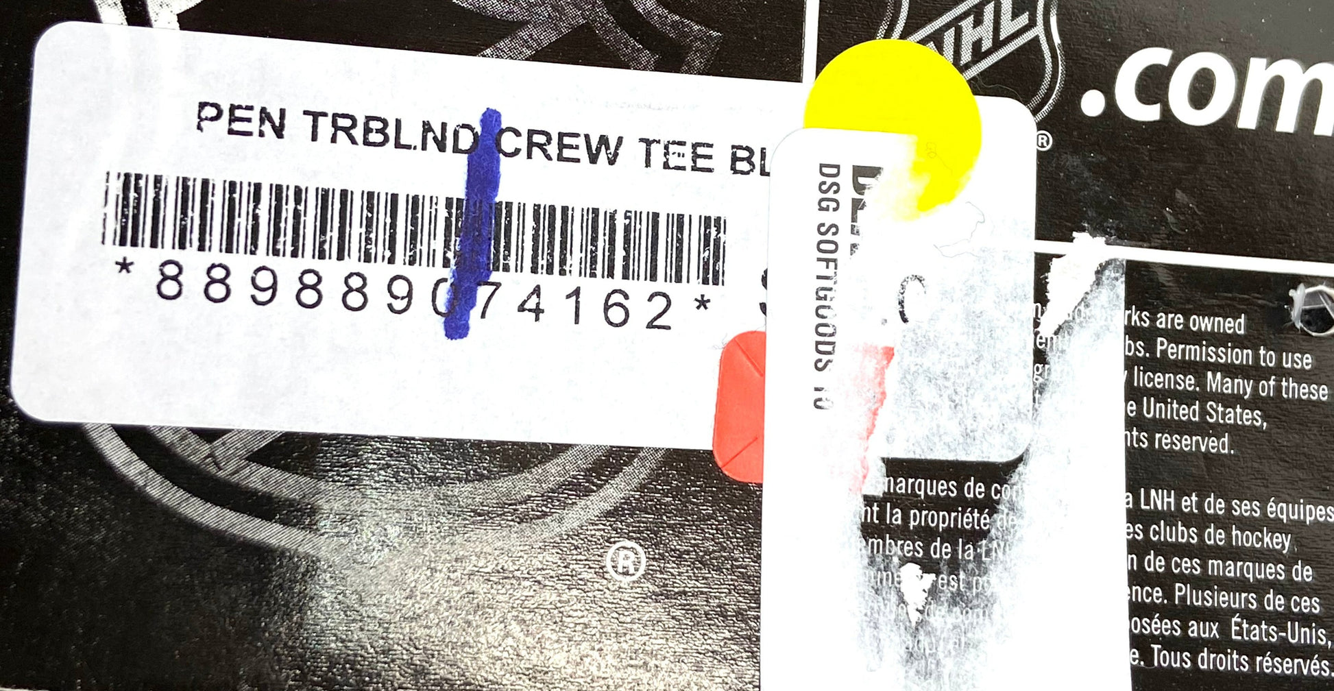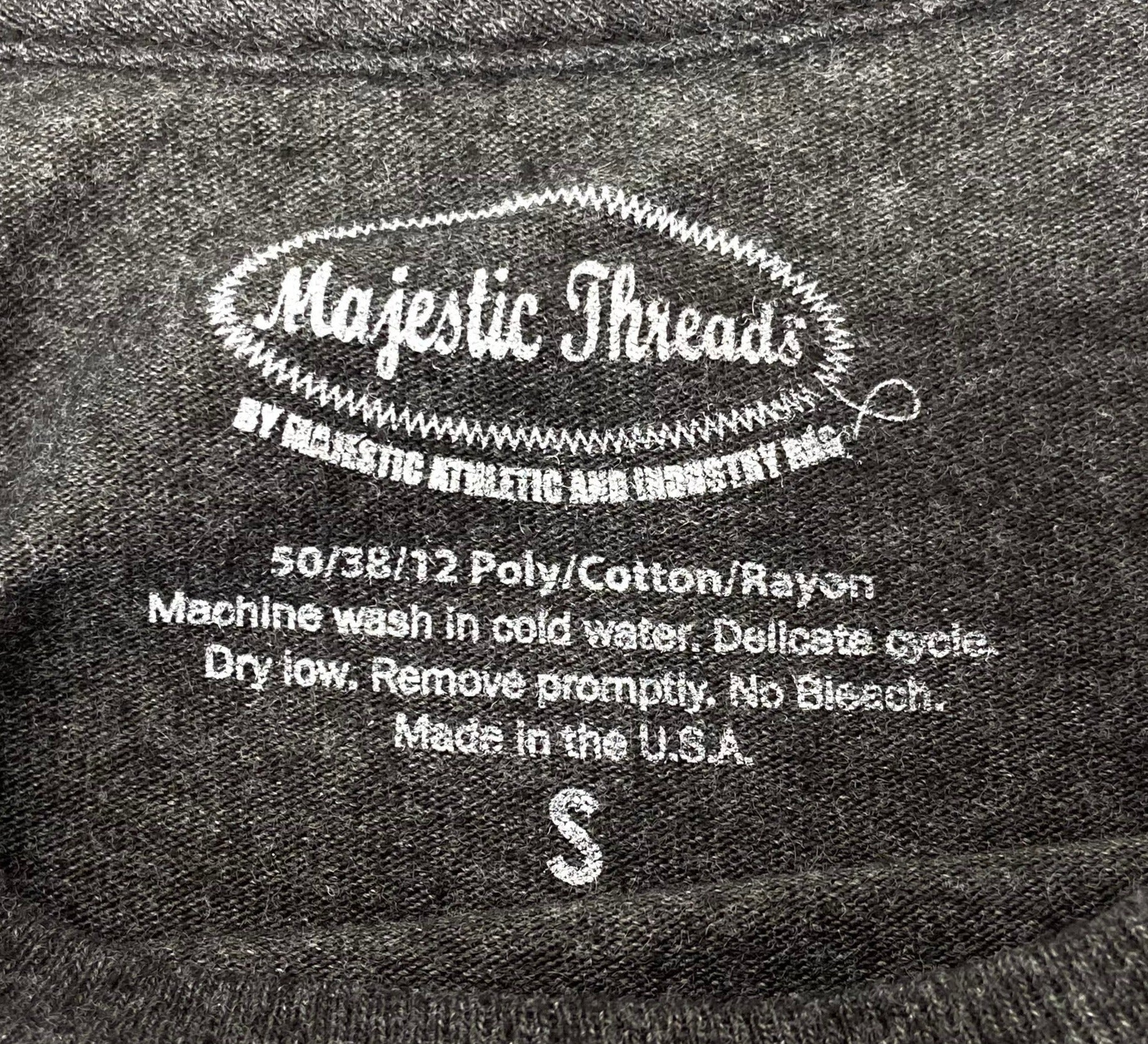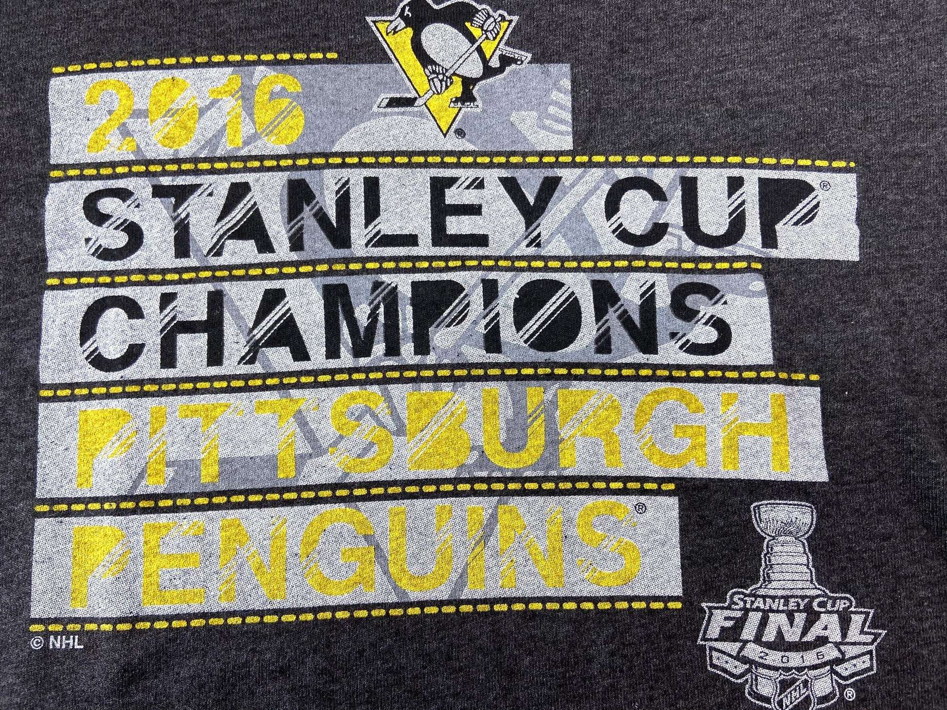 Okay, Pens fan, here's yet another in our long litany of Pittsburgh Penguins t-shirts. This one happens to be a women's small, so we are targeting a very select group of folks here. This 50% polyester, 38% cotton, and 12% rayon NOS tee is pretty sweet. The block print on dark gray looks great and it not only has all of the original tags; it was made in the good ol' USA to boot. As we say with most of our t-shirts that pinpoint a specific world champion: Maybe you didn't actually attend any of the playoff games, but now you can pretend you did. For comparison's sake, across the chest we measured 18" and from top to bottom we measured 24".