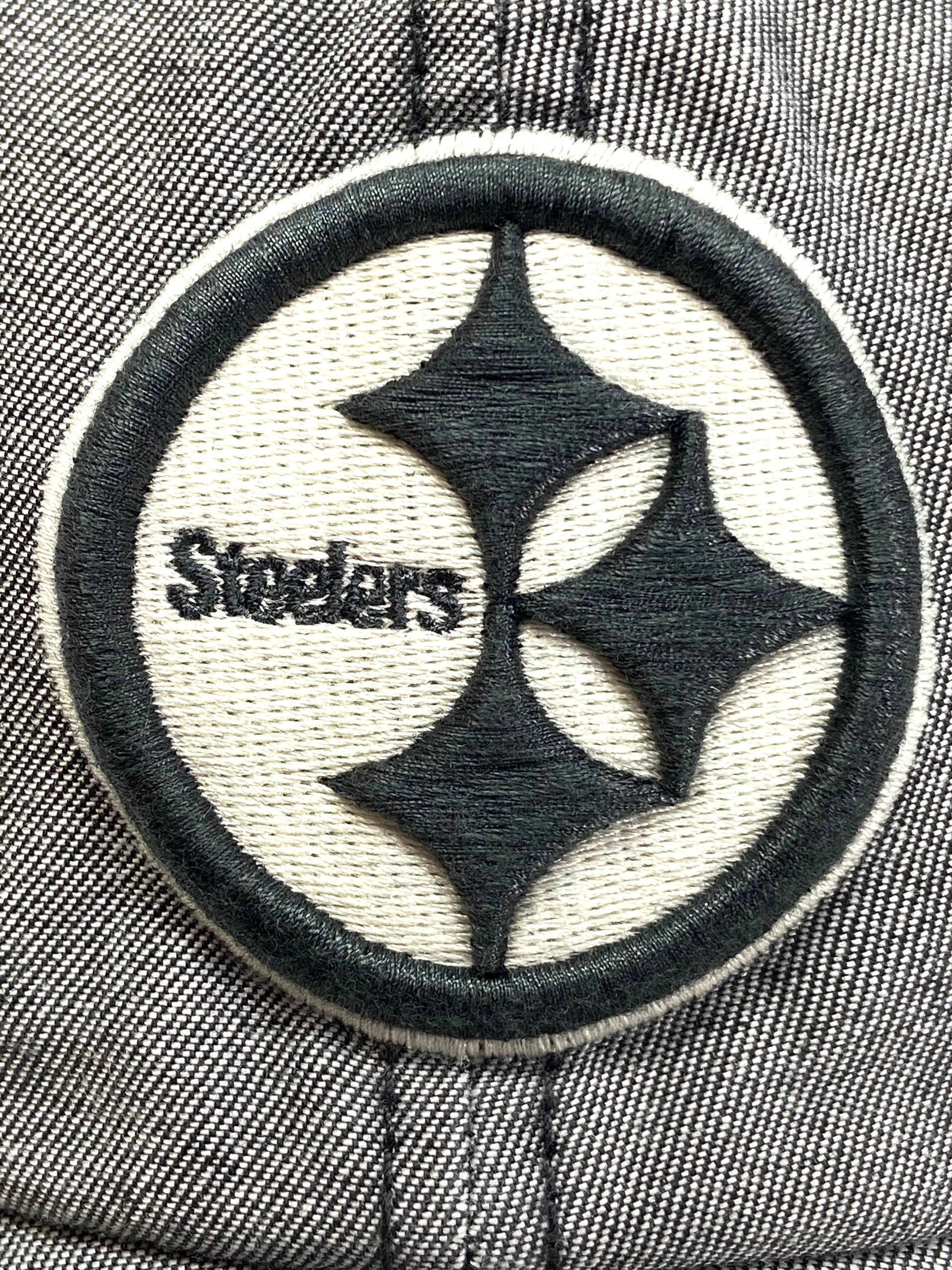 When you look at the photos of this Steelers cap, you may feel like you stepped into a time machine and are looking at the hat on an old black and white television. Fret not, friend, you're not losing touch with reality...that's how it's supposed to look! These are sized hats, and they are gray. They are constructed with 51% cotton and 49% recycled polyester. So, even if you're questioning your eyesight, there's no denying you're doing your part for recycling. With hanging hook and stickers; made in China.
