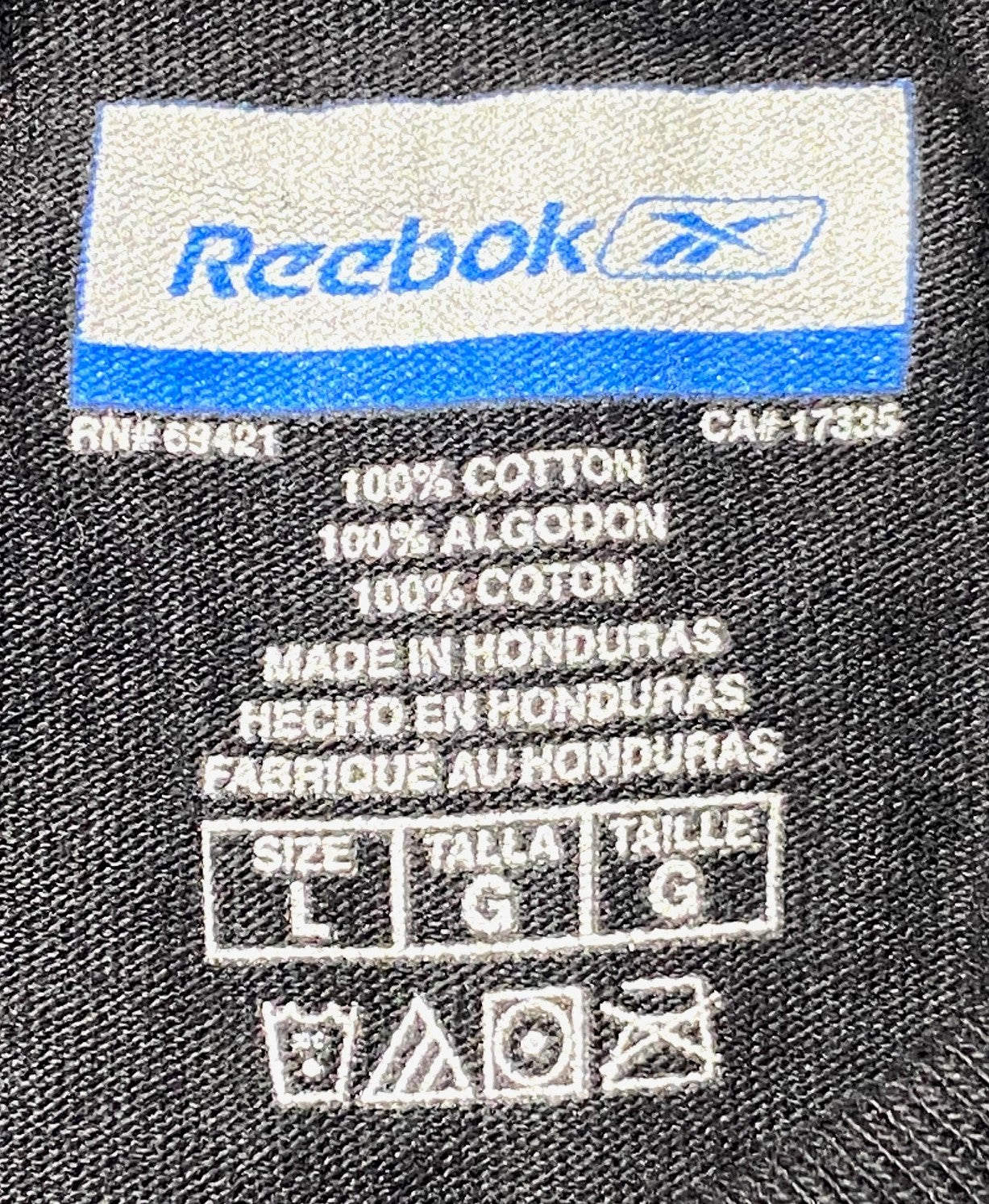 Anyway, it's 100% cotton, and black, and was made in Honduras by Reebok. It has the original tags. Be sure to check out the photos!