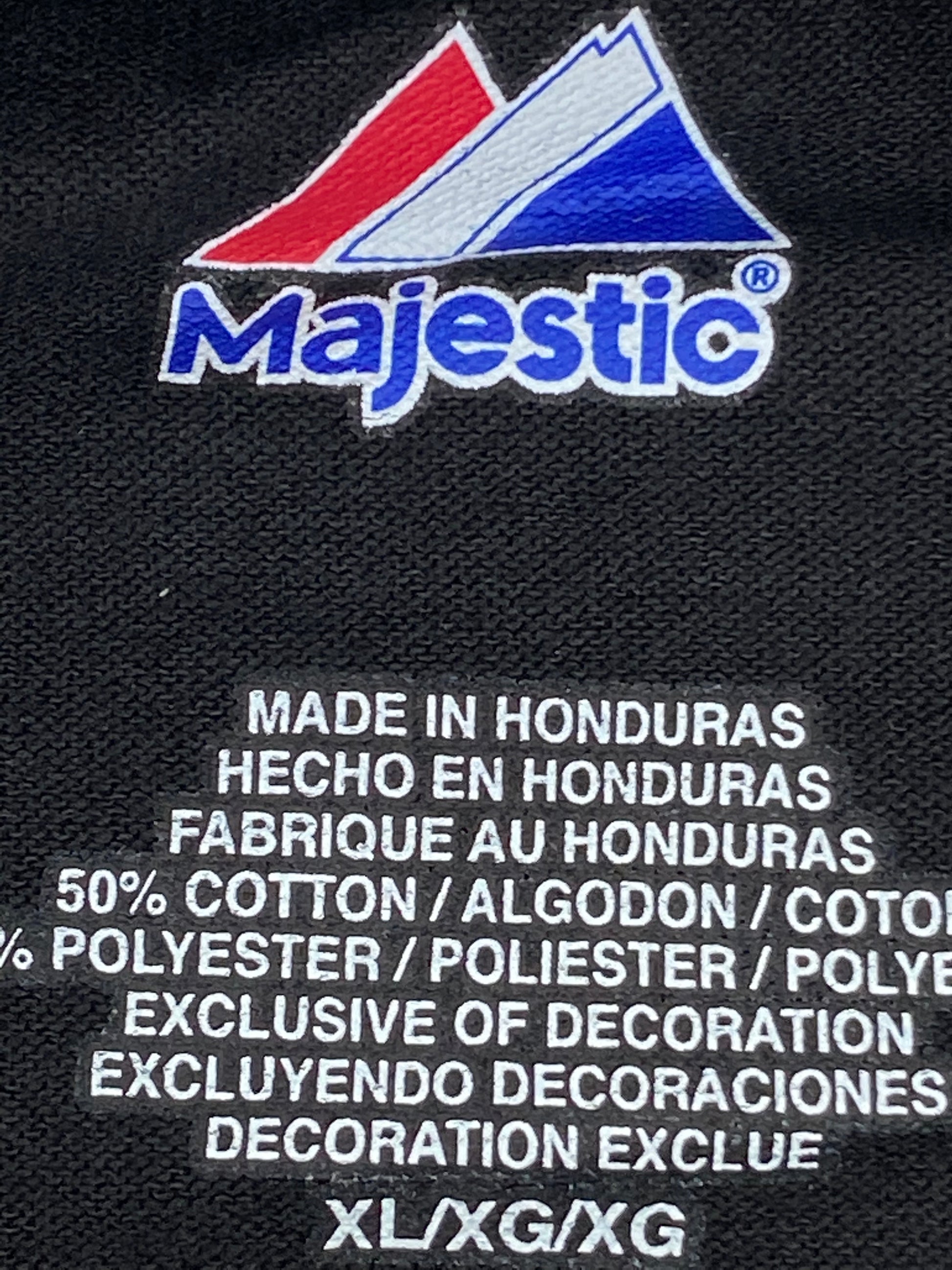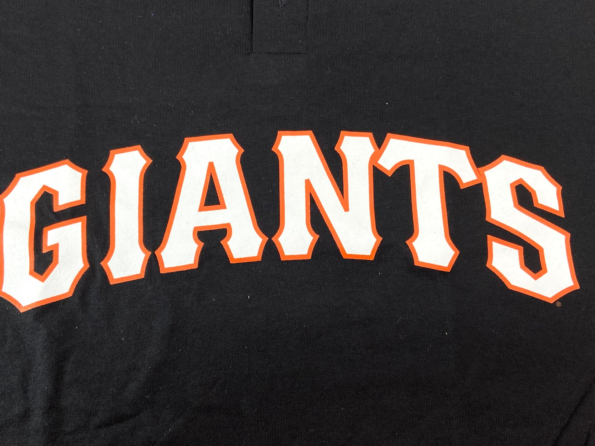Here is an awesome new black 50% cotton/50% polyester tee in adult size Extra Large in a choice of white or orange letters that you'll simply love! The button-down top with the traditional Giants block logo makes for a nice tee. And, being made by Majestic, you know it's a great product. For the adult extra-large NOS tee, we measured across the chest and got 24 inches; and from top-to-bottom, we came up with 31"; see how that compares with your current clothing fit. Both color choices were made in Honduras. Play ball!