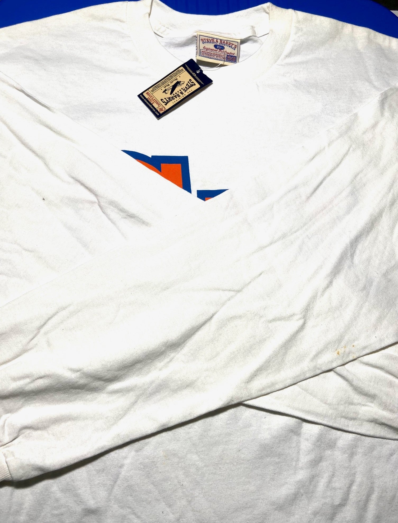 Here's a great adult XL long-sleeve NOS t-shirt from Steve and Barry that will make any Orange fan proud (providing they wear this size). This T-shirt is 100% cotton, and white, and was made in Mexico. We measured 22.5" across the chest, 30.5" top-to-bottom, and a sleeve length of 20" to assist you in determining if this size will work. Because that's how we roll.