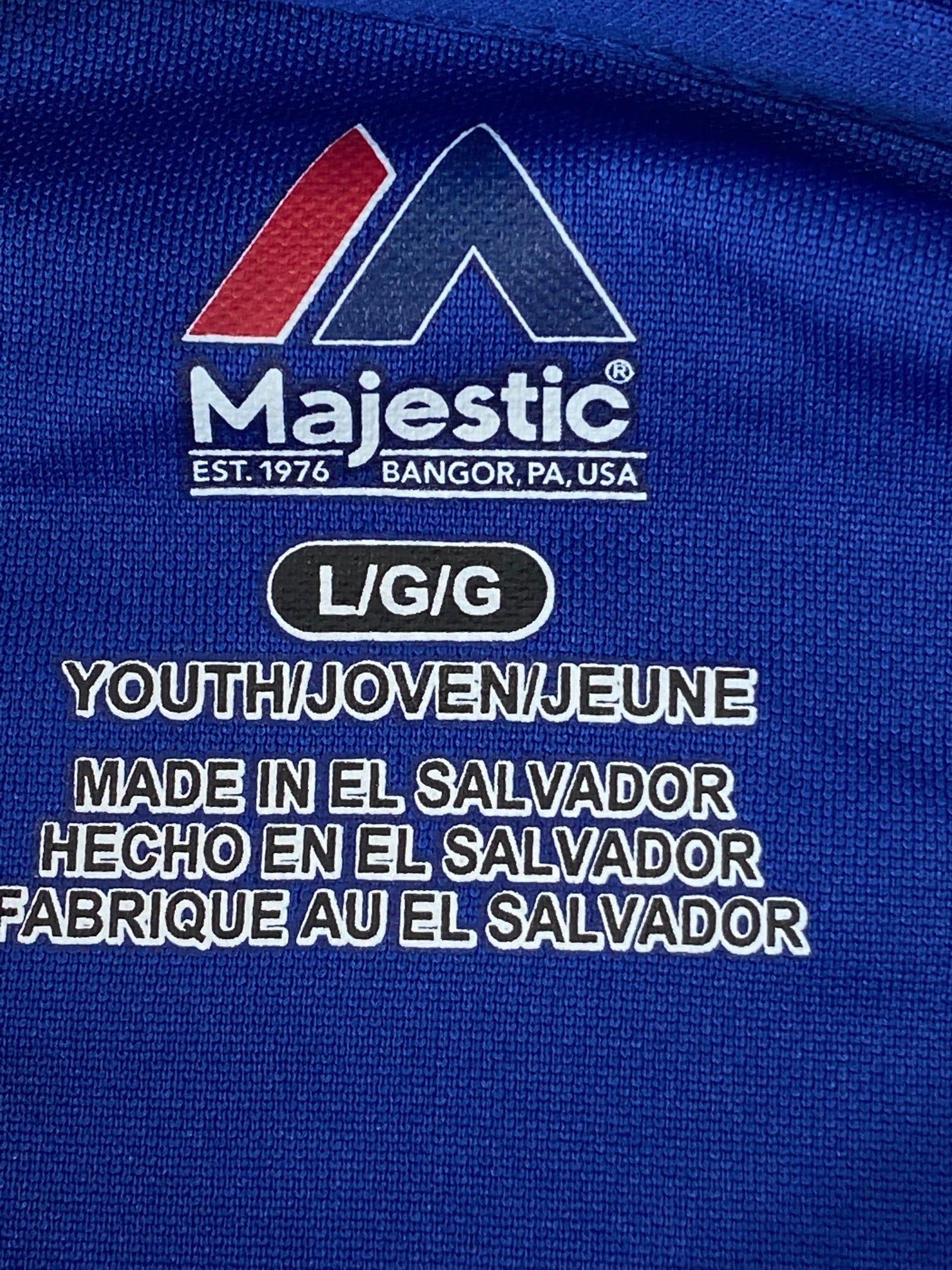 Majestic's awesome T-Shirt with Cool Base technology is manufactured with interlocking moisture-wicking fabric for a lightweight, breathable feel. This T-Shirt is Youth Large sized. (For comparison purposes, we measured and got 18 1/2" across the chest, and 25" top to bottom.)