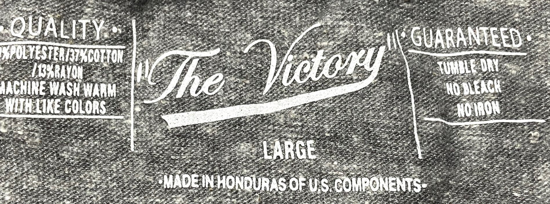 Anyway, it's 50% polyester, 37% cotton, and 13% rayon. This NOS t-shirt is gray and was made in Honduras by The Victory. It has the original tags. Be sure to check out the photos!